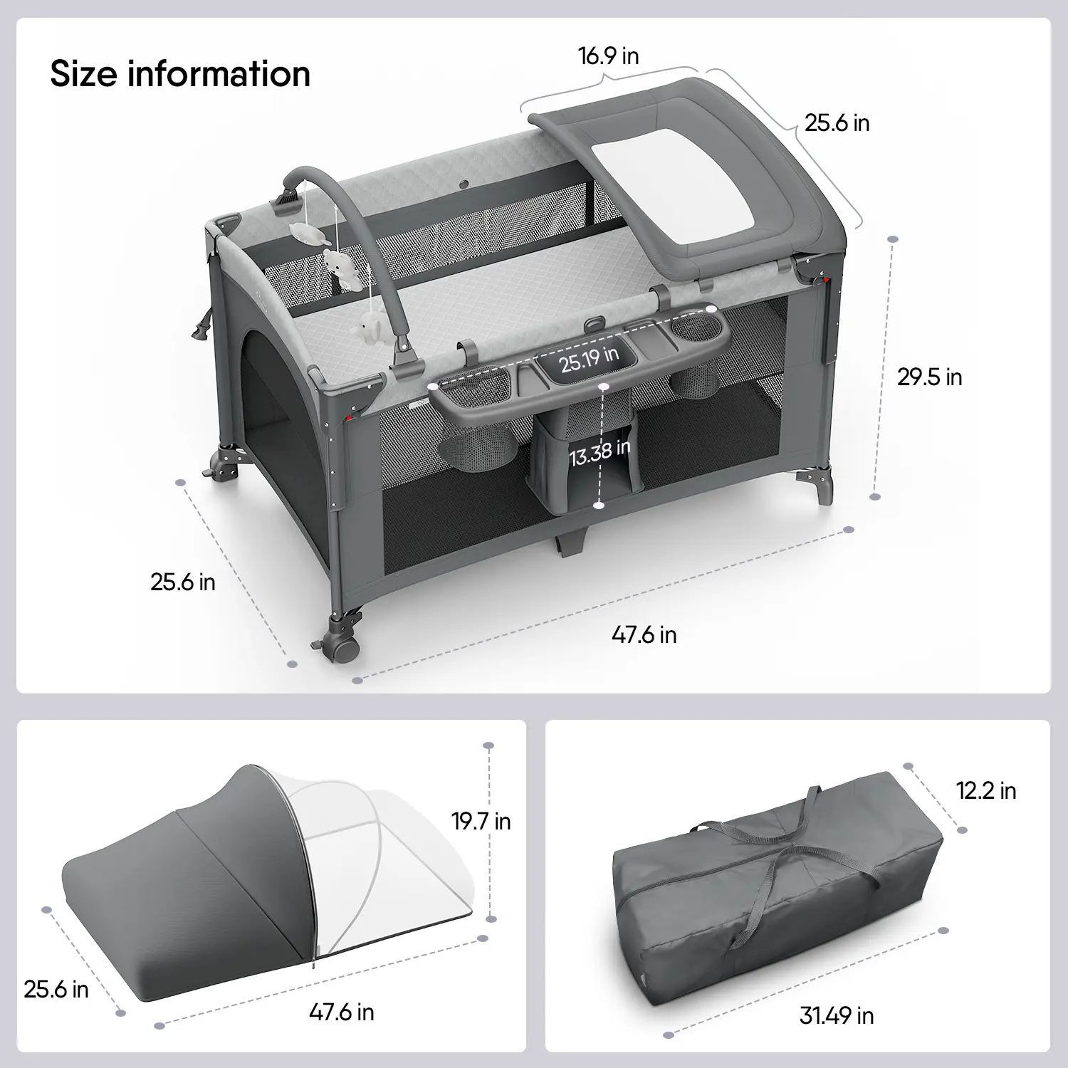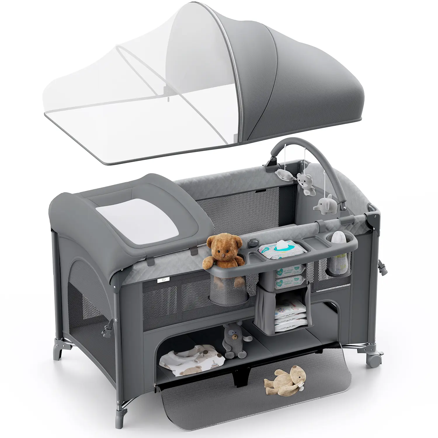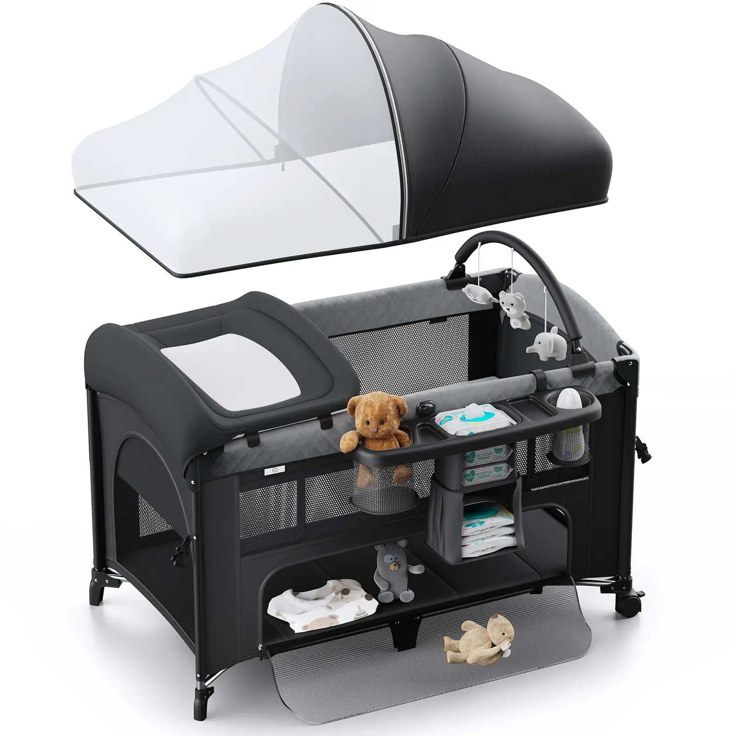 ·[Versatile 5 in 1 for Baby's Growth] BabyBond nursery center suits newborns to toddlers. Convertible to bassinet, bedside crib, playpen, travel crib & changer. Newborn bassinet's removable. Spacious playard has a zipper for baby.