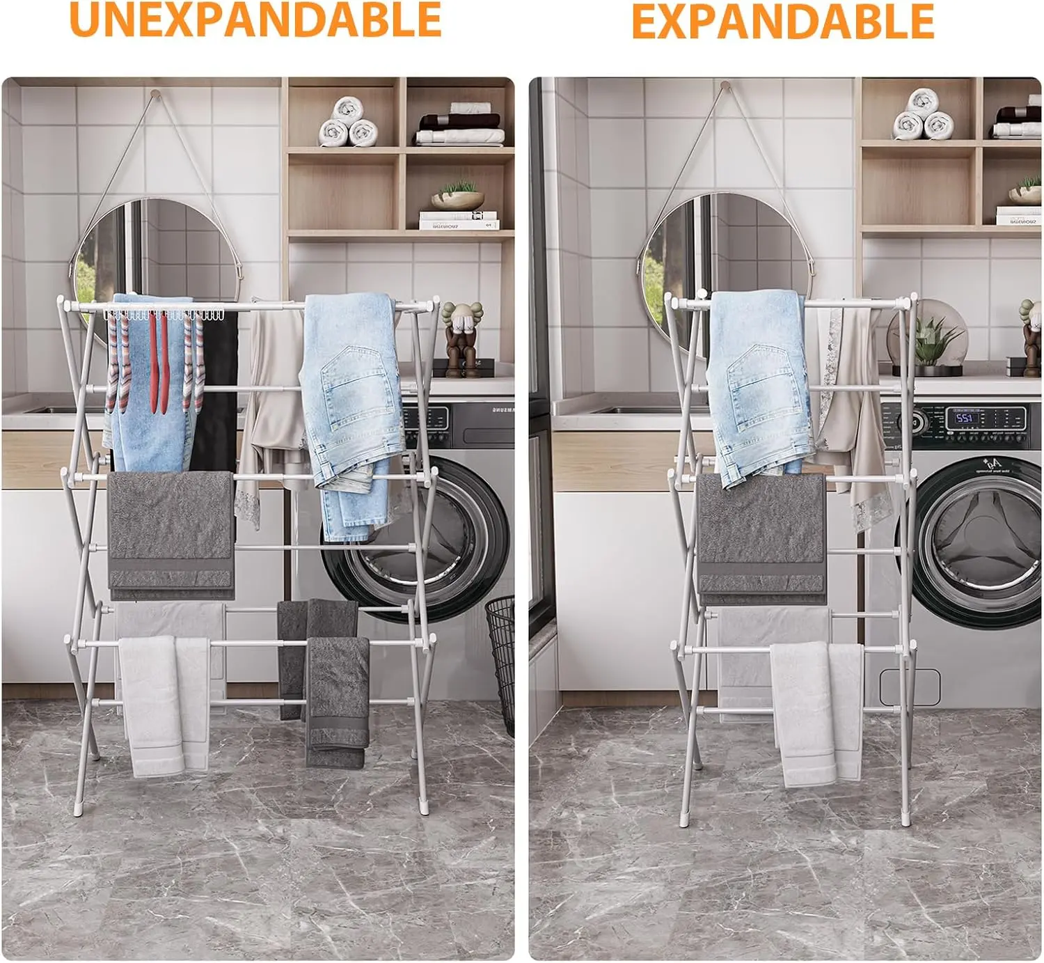 The accordion-style frame folds flat in seconds for easy storage. Perfect for small apartments, laundry rooms, dorms, and balconies.