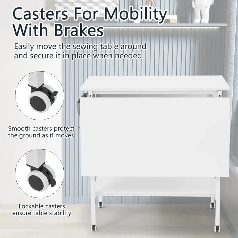 Featuring two spacious storage shelves and a side pocket, this table keeps your fabrics, craft supplies, and tools organized. Frequently used items are always within easy reach.