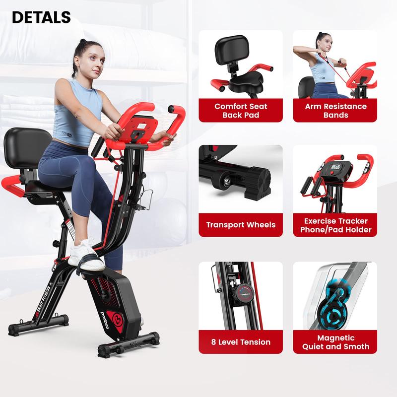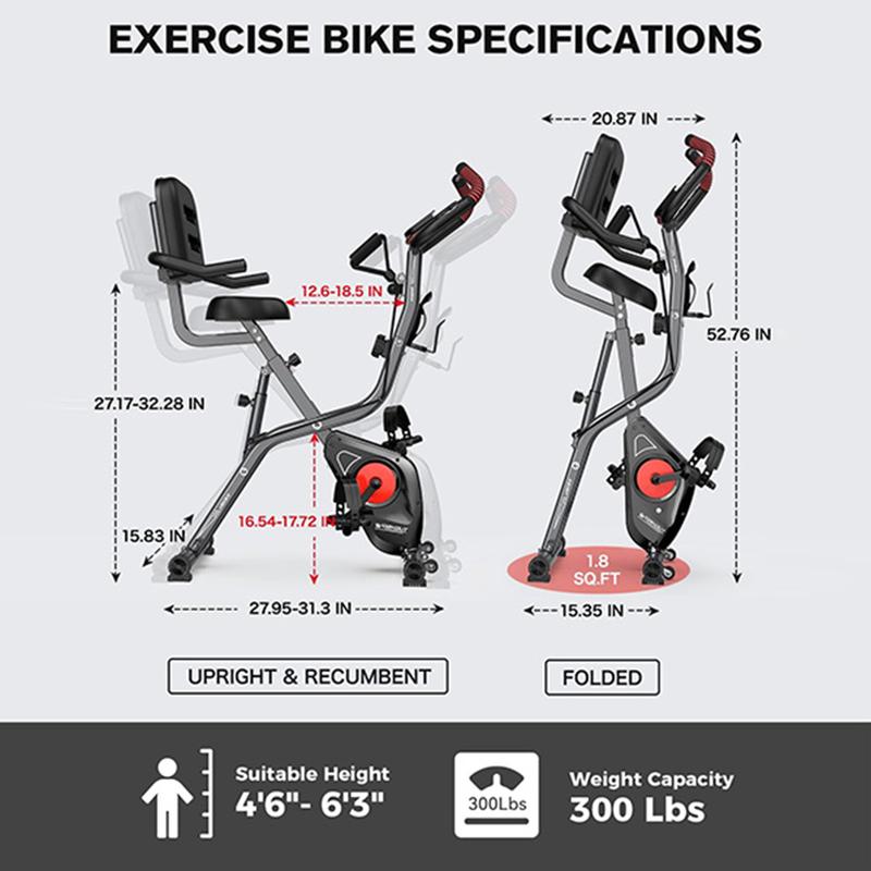 4-IN-1 Folding Exercise Bike for Home Workout: The upright posture of this bike provides you with high-intensity exercise, helping you burn more calories. The semi-recumbent posture offers a low-impact and more comfortable riding experience. Additionally, this bike comes with arm resistance bands (which can be attached either at the front or rear of the bike) to help tone your upper muscles and provide a complete body workout