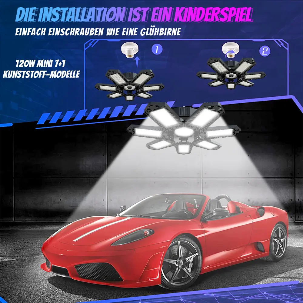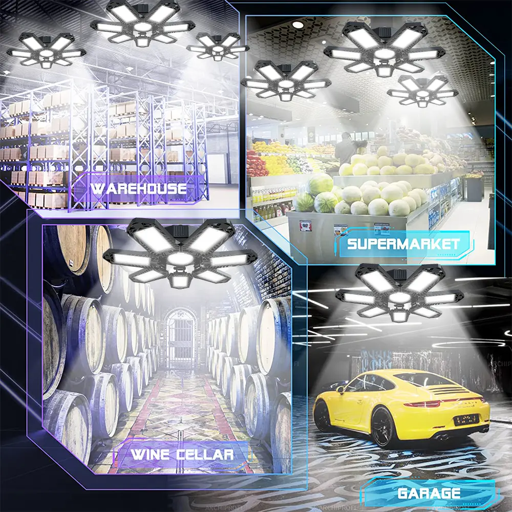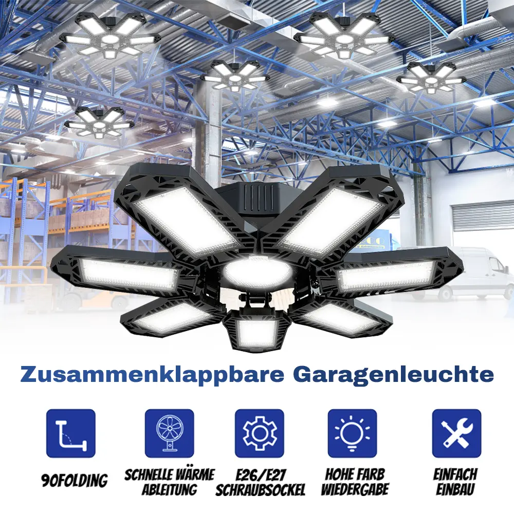 The FOLDABLE GARAGE LIGHT offers super bright illumination, adjustable panels, easy installation, and a long lifespan, making it perfect for various applications such as garages, basements, workshops, warehouses, and more. With its 600W power, 60,000 lumens, and 6500K color temperature, it provides even, super-bright lighting for comfortable and safe lighting. The 7+1 panel design ensures 360° full coverage without dark spots, and the E26/E27 socket compatibility makes installation hassle-free.