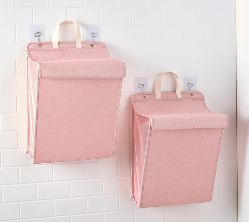 ·Includes two foldable hanging hampers and four adhesive-backed hooks