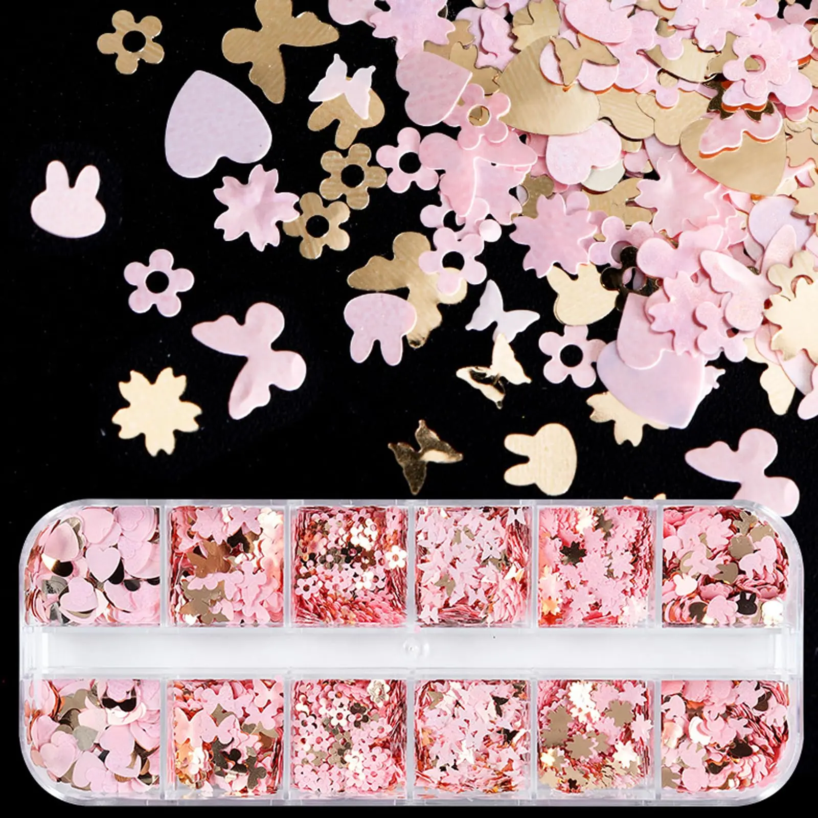 ·Nail Glitter Decoration Kit: Includes 1 box of 12 fruit-shaped nail fomi slices, 1 box of iridescent star nail sequins, 1 box of 12 mixed gold and pink nail glitters, 1 box of irregular-shaped nail sequins. Each glitter item is individually packaged in a storage box to prevent spillage and ensure convenience for your nail designs