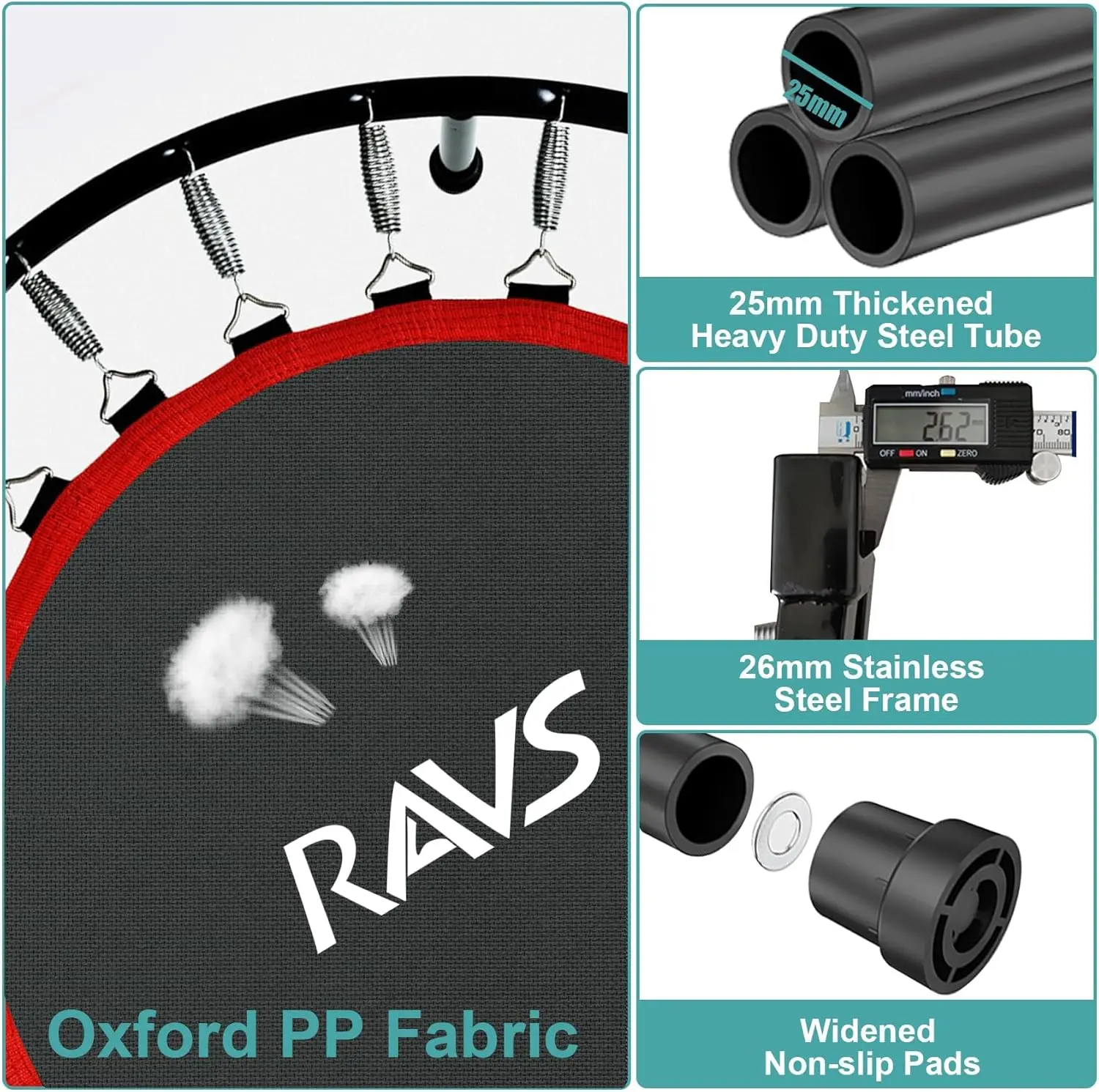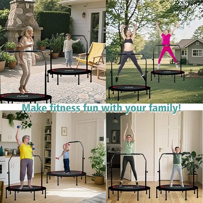 Material Upgrade:  exercise trampoline features 3mm heavy-duty  steel  frame  and  28  industrial  springs  that  survived  3,000+ jump simulations. The anti-slip PP mat with cross-stitch  reinforcement  securely holds 350lbs, making it the  safest  rebounder trampoline for adults doing HIIT or family fitness time. 5-Levels Height Adjustable Handrail: The RAVS fitness trampoline is designed with a 5-level  adjustable handrail  (38"  to  46"), making it perfect for both kids and adults. As children grow, the handrail adjusts to provide continuous support, ensuring stability and safety during every jump. Whether you're using it as a fun activity or an intense workout trampoline, this design adapts to your fitness needs for long-term use. Foldable Frame Design: The RAVS indoor trampoline features a unique foldable design, allowing it to be reduced to 1/4 of its size after removing the handle and legs. This workout trampoline for adults is easy to store anywhere—making  it a  convenient fitness solution for any home. Easy to Assemble: Unlike bulky trampolines, our mini trampoline for adults arrives with the jumping mat already securely attached to heavy-duty springs. Attach the legs, tighten the screws, and start jumping. Perfect for busy schedules! Efficient Customer Support: We offer 12 months of quality service for your peace of mind. With RAVS parts warehouses located across the U.S., we ensure fast and hassle-free after-sales support whenever you need it. Choose Your Perfect Fit: Choose the 40-inch model (3.3ft diameter, about the width of a loveseat sofa) for apartment-friendly bouncing, or upgrade to the 48-inch version  (4ft wide, similar to a standard kitchen table)  for backyard  energy  burning sessions.