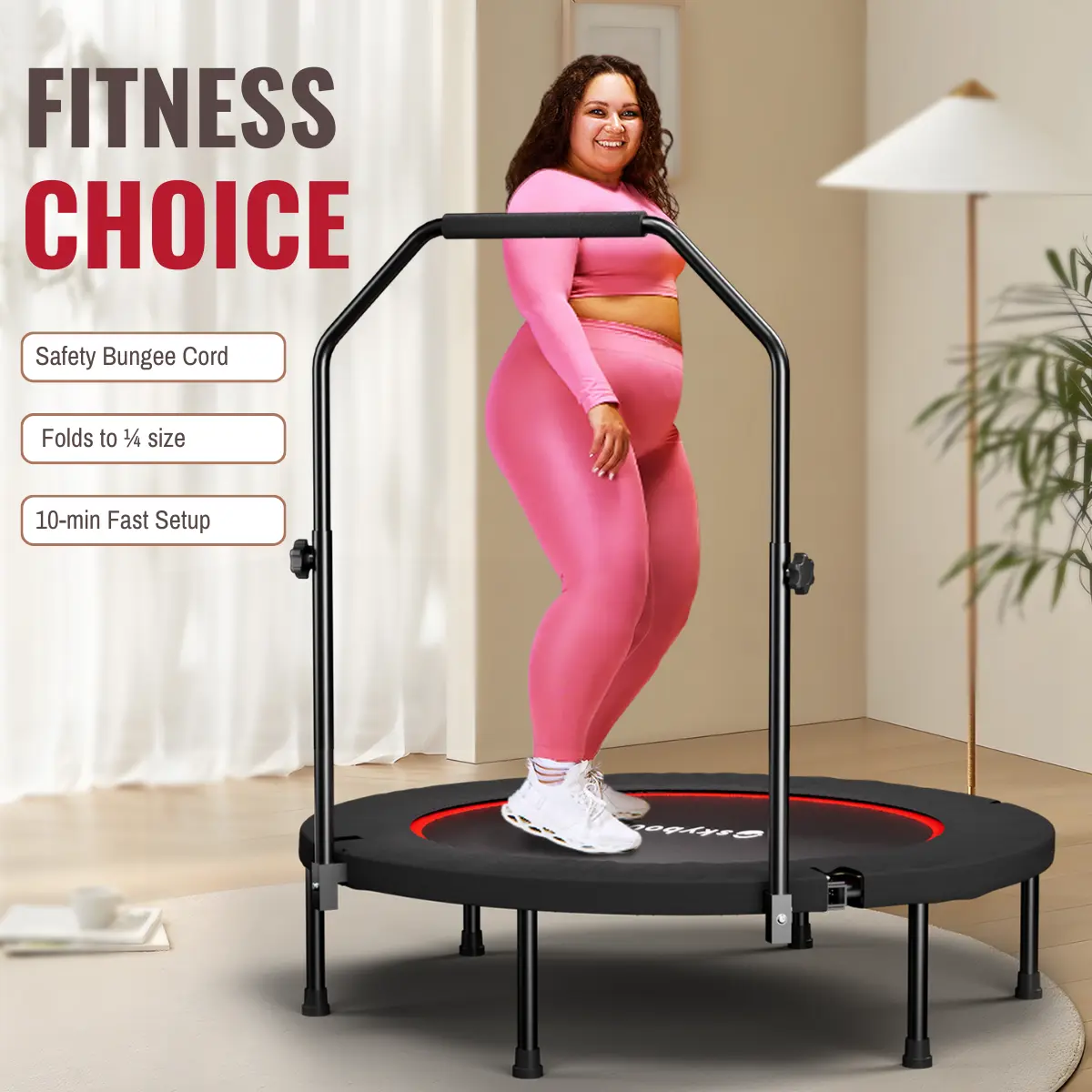 Adjustable Handlebar for Customized Workouts: Heavy-duty foam handlebar with three adjustable height levels (2'7", 3'1", 3'4") to suit your comfort and support needs. This makes it an excellent rebounder trampoline for adults of all fitness levels.