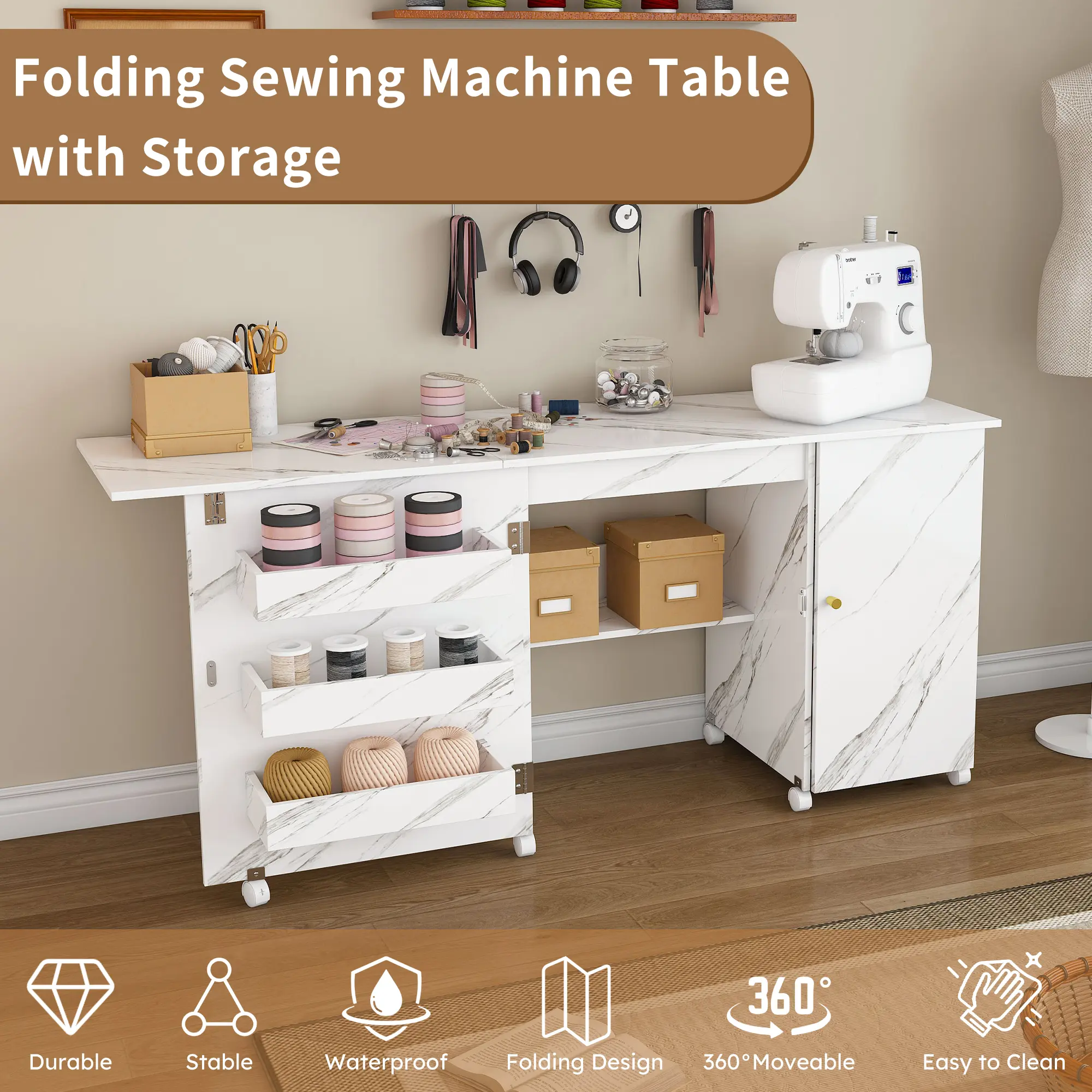 ·Customizable Storage:Organize all your sewing essentials with multiple storage options including a single-door cabinet, three hidden bins, and a bottom open shelf.