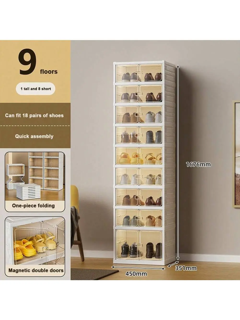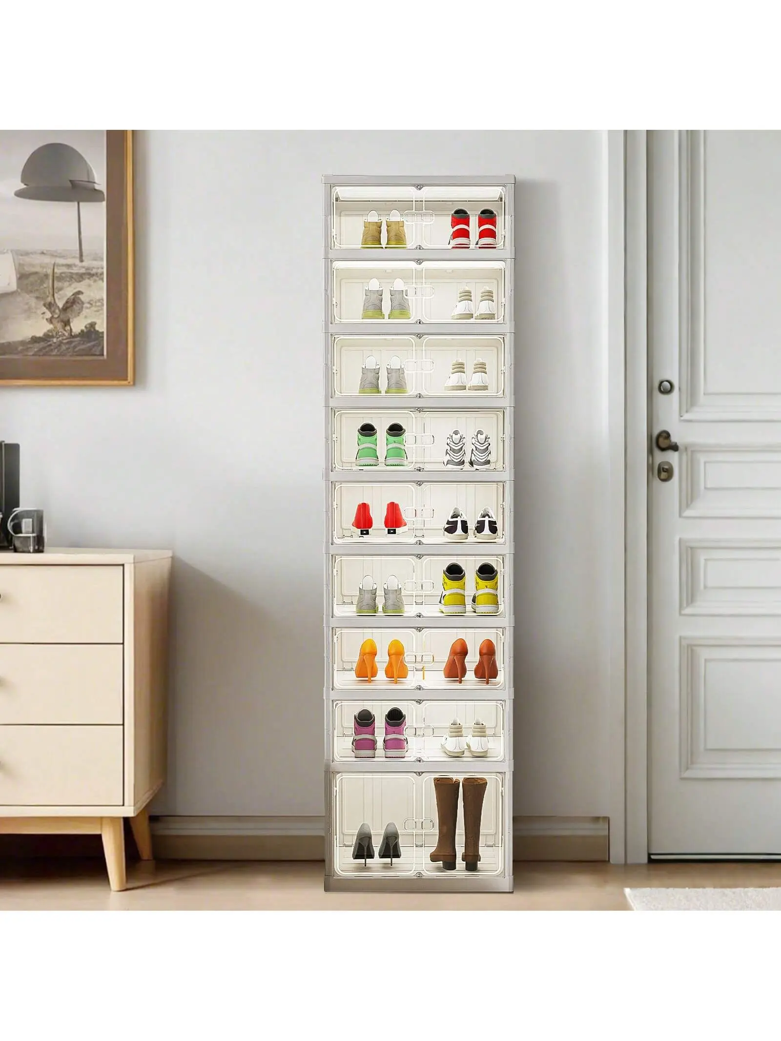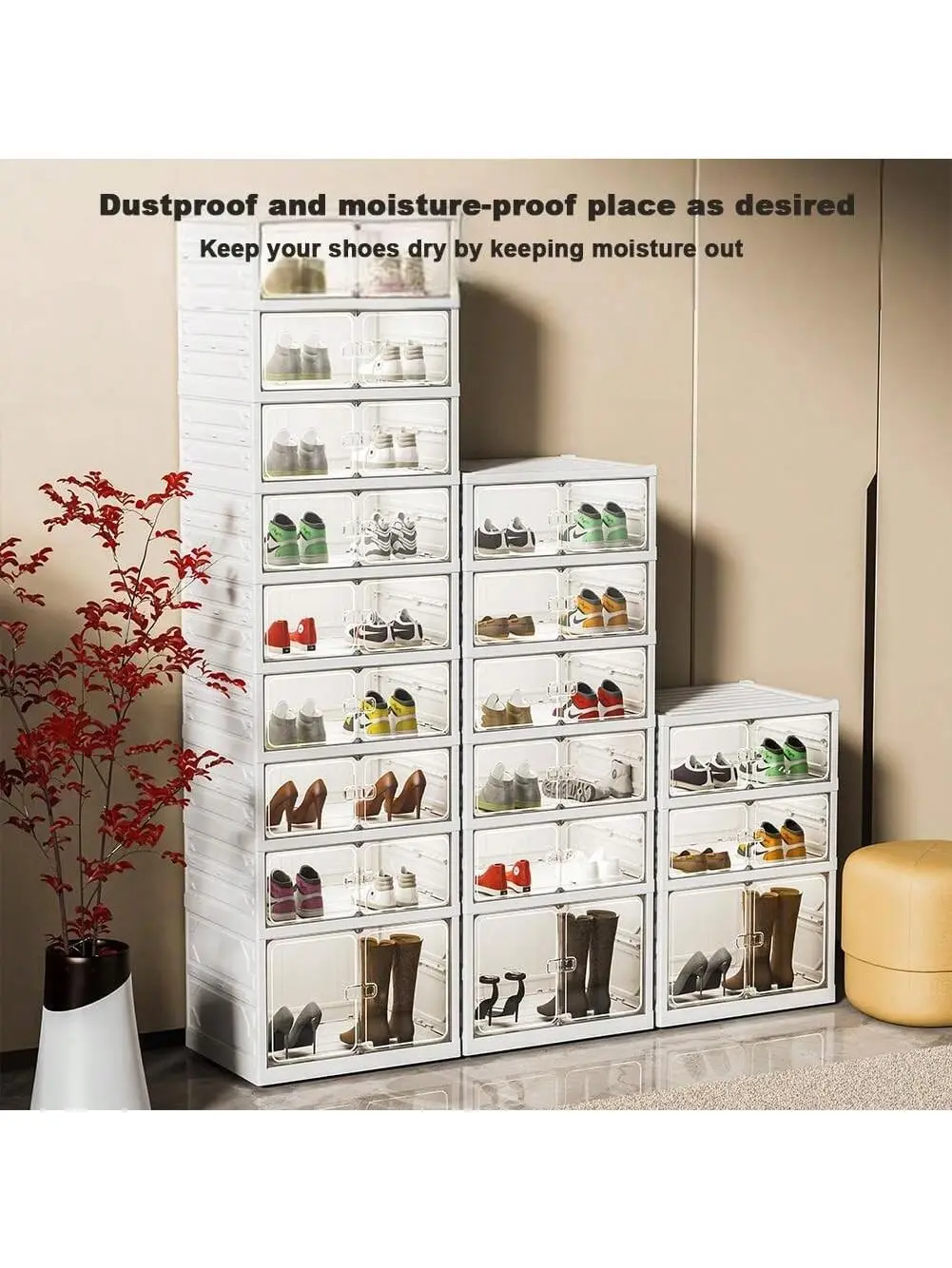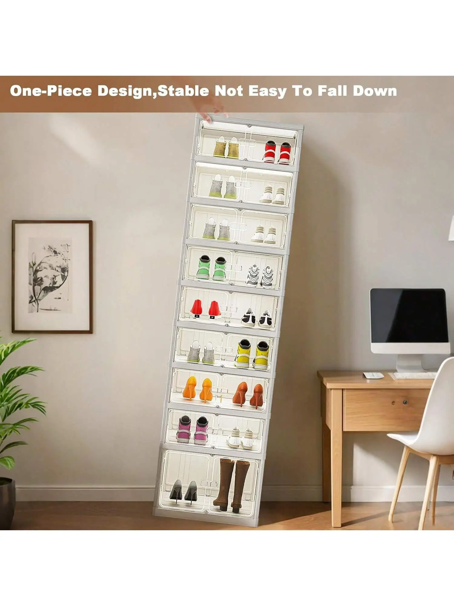 Stackable Transparent Shoe Boxes: The transparent magnetic doors make it easy to access your shoes. The stackable design allows for effortless folding and storage, making it suitable for multiple spaces such as bedrooms, studies, or attics.