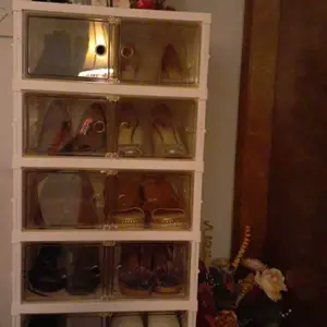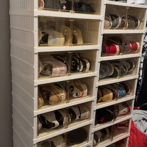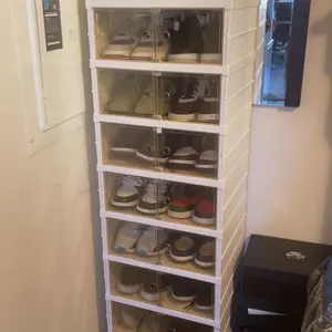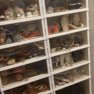 ·【MATERIAL&DESIGN】Stackable shoe boxes is made of high quality plastic (PP+PET) material,which looks very fashionable.foldable plastic shoe box has super suction,which can keep the door closed and dust proof.The unique foldable integrated design makes the clear shoe storage organizer more stable.You can easily organize your shoes and store other items. The wholes on the doors make it can ventilate, make the shoes "fresh". The top of the shoe rack can also upload things like shoes or decorations.