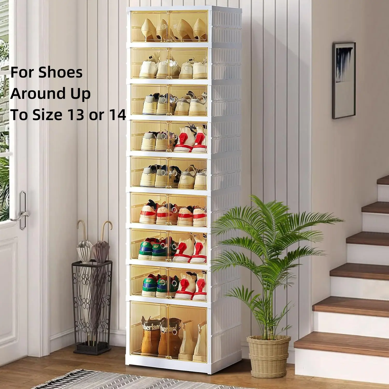 ·【Tall BOOTS STORAGE DESIGN】The expandable size of the plastics foldable narrow shoe rack:17.32"L*13.58"W*61.41"H(9 tiers A), 17.32"L 13.58"W x 66.54"H(9 tiers B),including 9 Tiers(8Grids + 1Large grids).Narrow tall shoe rack can accommodate up to 18 pairs of shoes.narrow shoe rack for entryway fits all types of shoes and can store men's and women's shoes up to size 15. 9 tiers B and 9 tiers C shoe rack has Large grids heightened design,suitable for storing long boots.