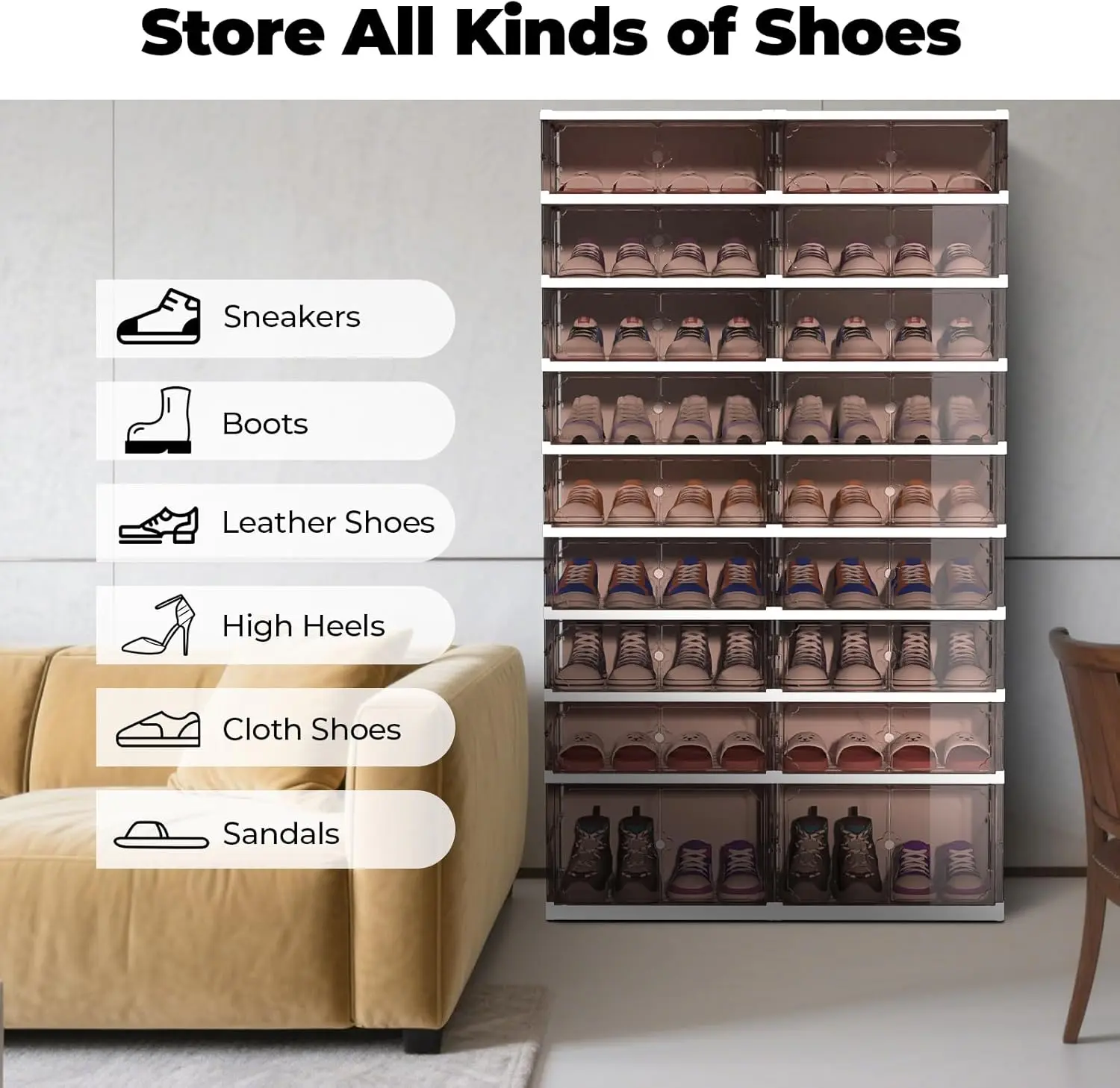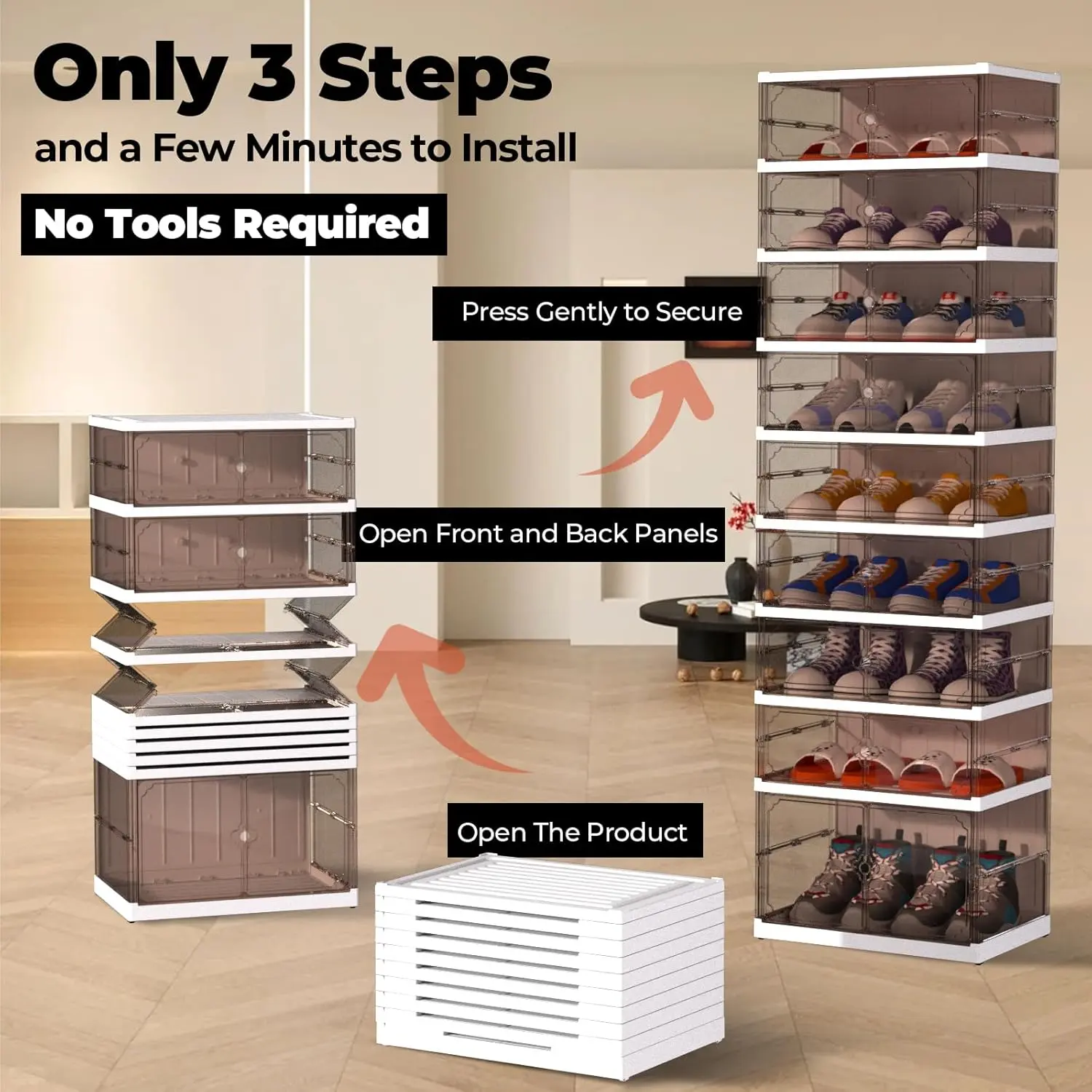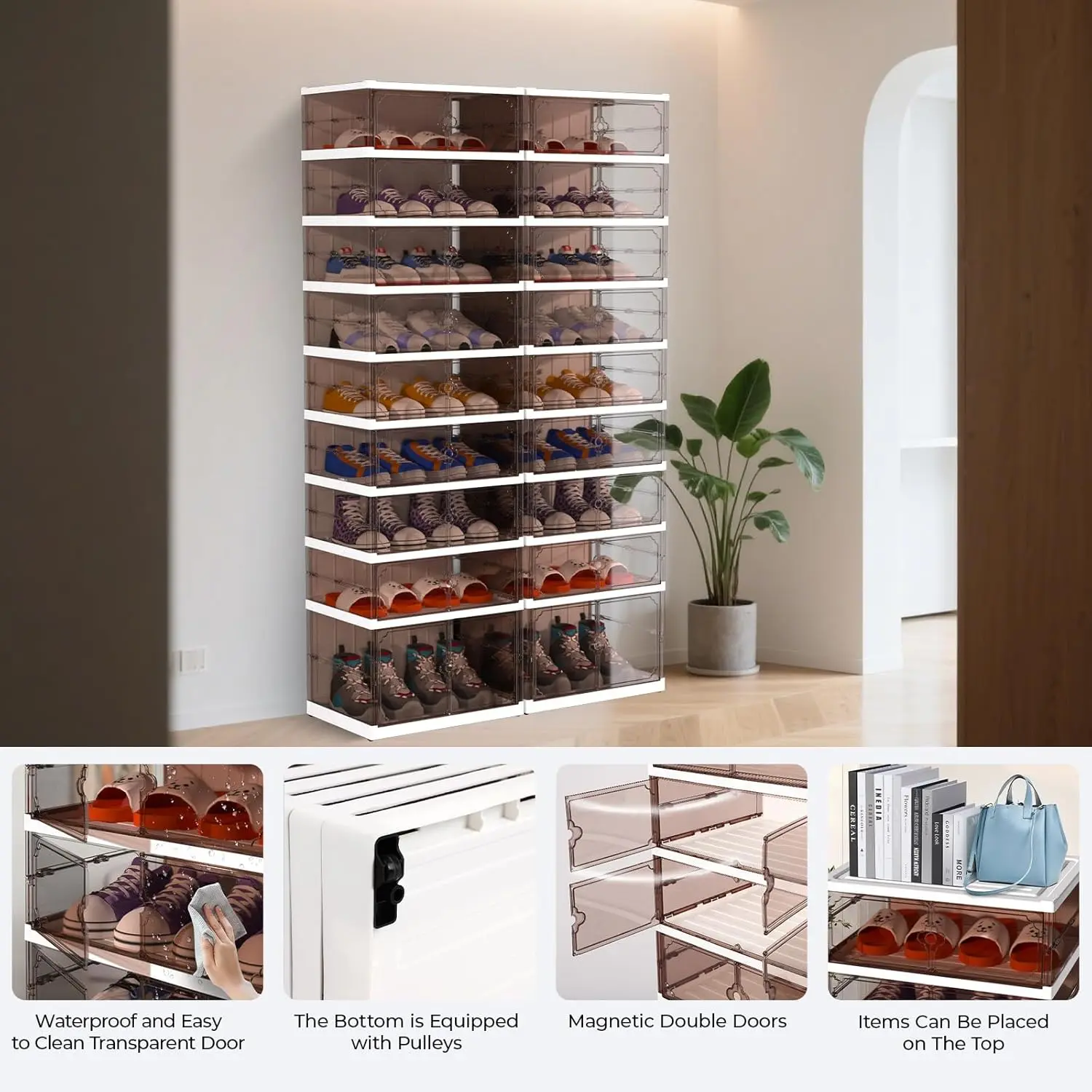 ·【Dust-Proof Magnetic Door】The elegant transparent front panel of the shoe storage cabinet not only displays your footwear beautifully but also protects them from dust and dirt. Enjoy the convenience of magnetic doors for effortless access to your shoes.