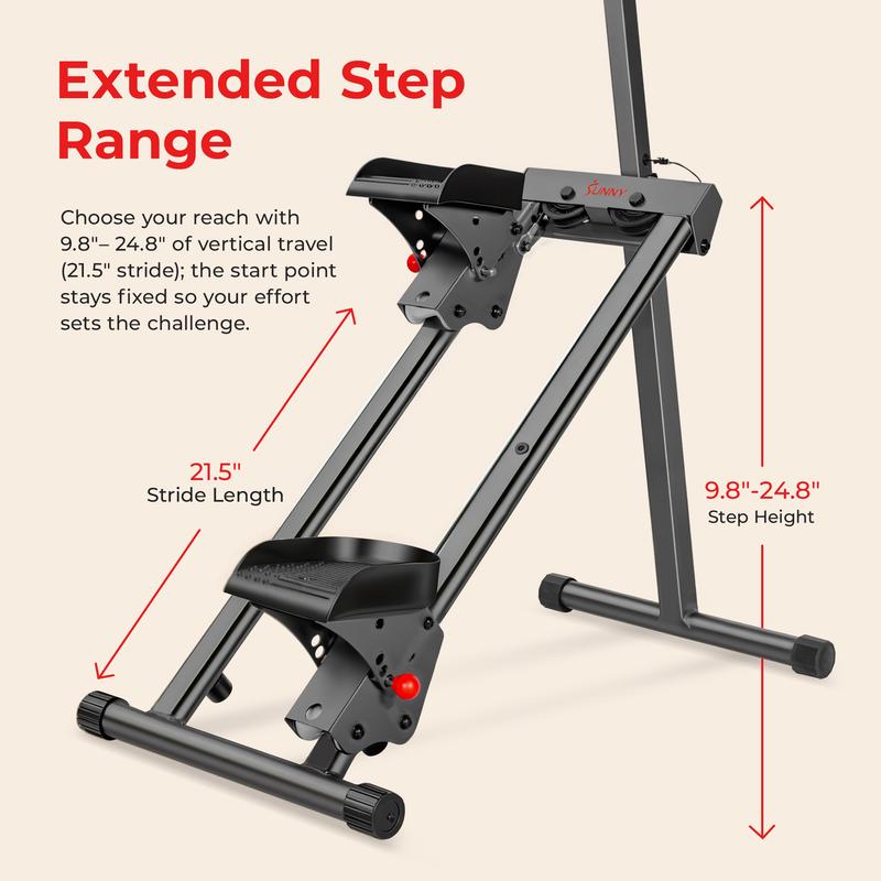 Introducing the Sunny Health & Fitness Foldable Stair Stepper Climber. This vertical climber is perfect for full-body home workouts. It features an extended step range, accommodating up to 330LBS. The compact storage design makes it easy to store and transport. Ideal for home gyms, it offers flexibility and convenience.