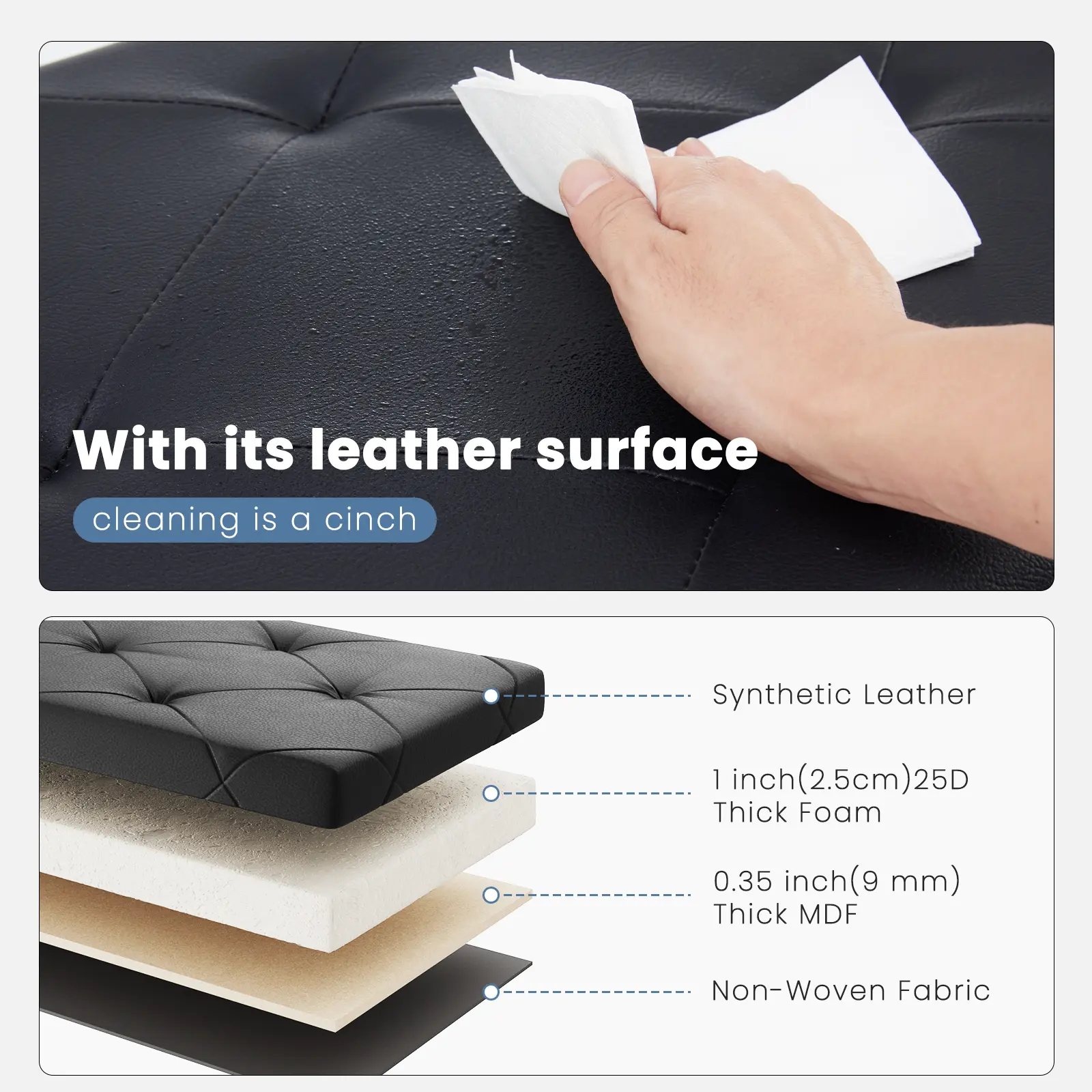 Made with PVC leather and enhanced, thickened foam cushioning, this storage ottoman is constructed to be more durable and long-wearing. Thickened MDF panels resist warping, ensuring strong stability and practicality. It has a load capacity of up to 660 lbs, allowing safe standing or use as a ladder.