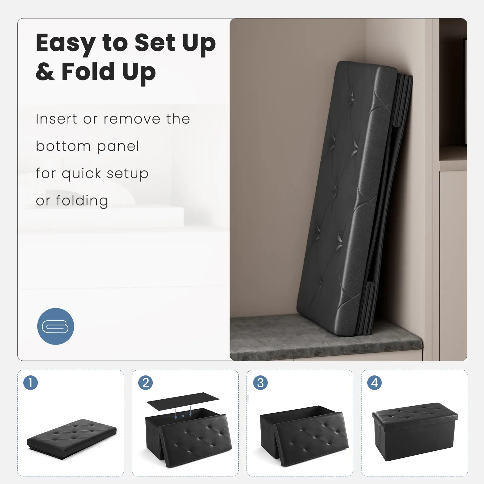 This ottoman footrest is designed for easy setup—just unpack and fold it into a tidy bench in one straightforward step. When unused, it fits neatly into corners, occupying very little space. Perfect for saving space when not in use.