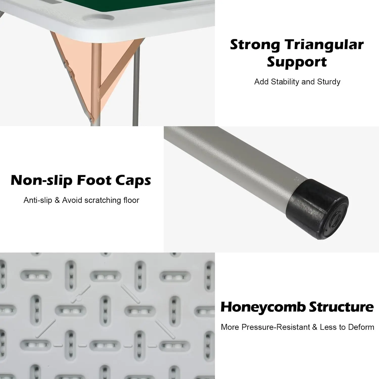 【Sturdy & Durable】It is made of strong and durable high-quality PE material and powder-coated iron frame. The non-slip feet and triangular support hinge design of the table legs add stability while avoiding scratching the floor. The honeycomb structure design makes the table top more pressure-resistant and less prone to deformation.It able to bear up to 265 lbs.