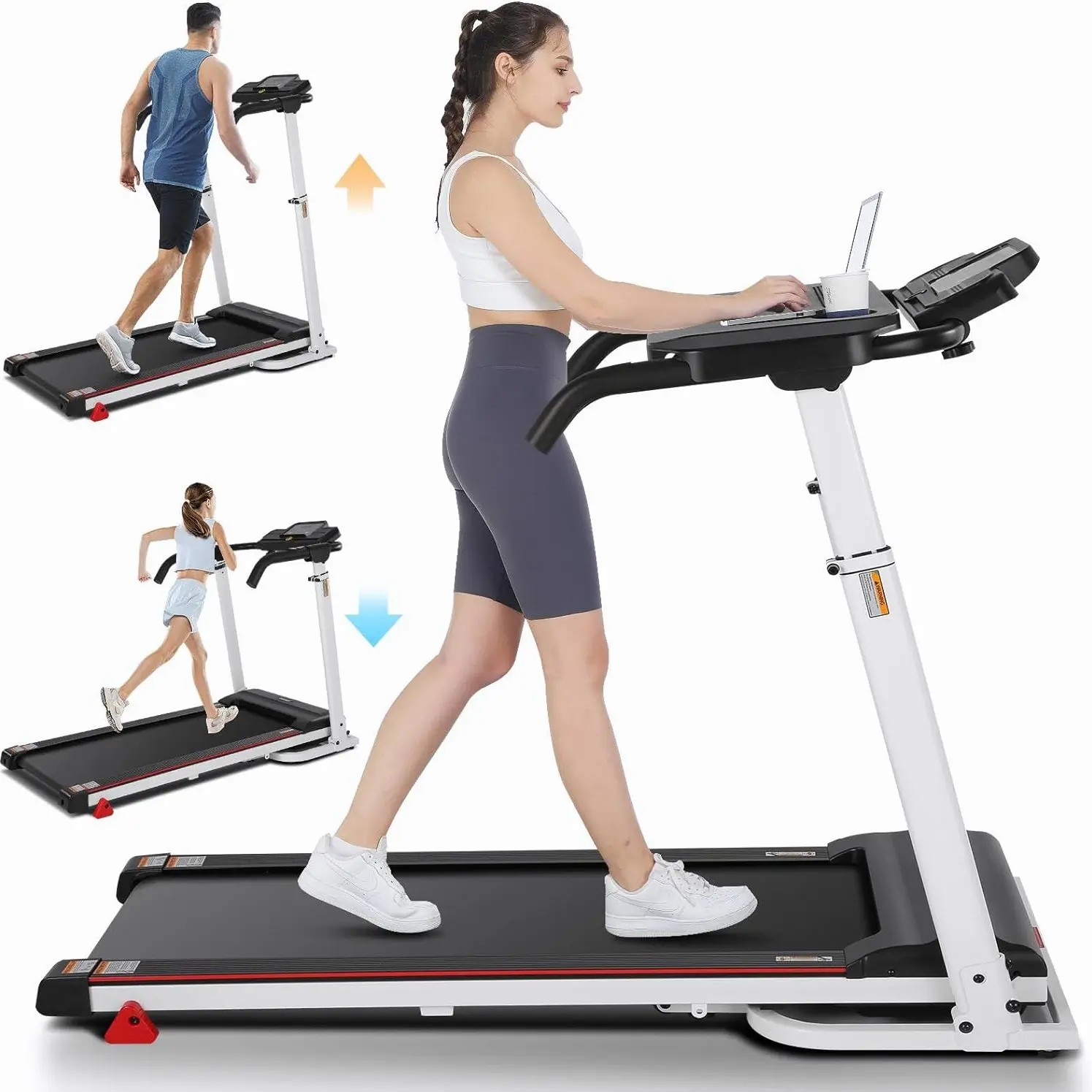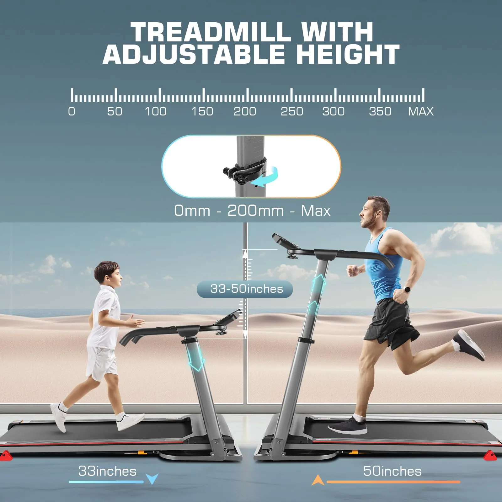·3 in 1 Folding Treadmill: This versatile treadmill serves as a working treadmill, running treadmill, and incline treadmill. With its adjustable height ranging from 33 inches to 50 inches (best suited for individuals between 4'1" and 6'6"), it accommodates the height preferences of most people. Whether you're a child or an adult, finding the perfect height setting is effortless.