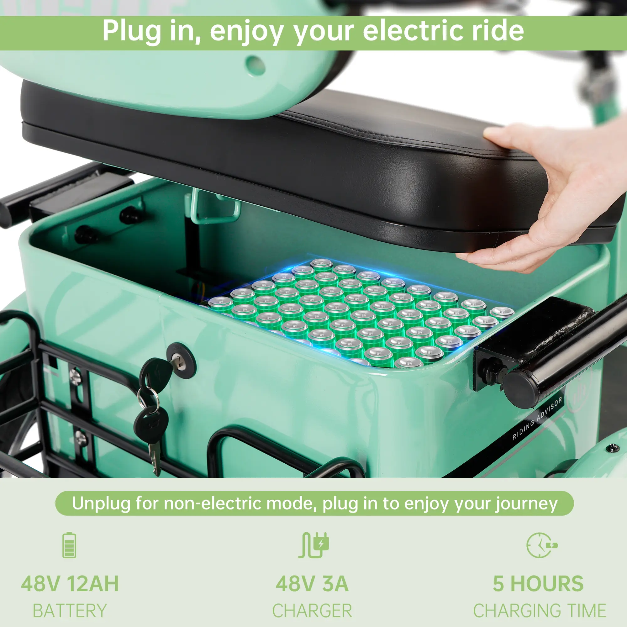 ·Long Range: 48V 13Ah battery – up to 44 km per charge