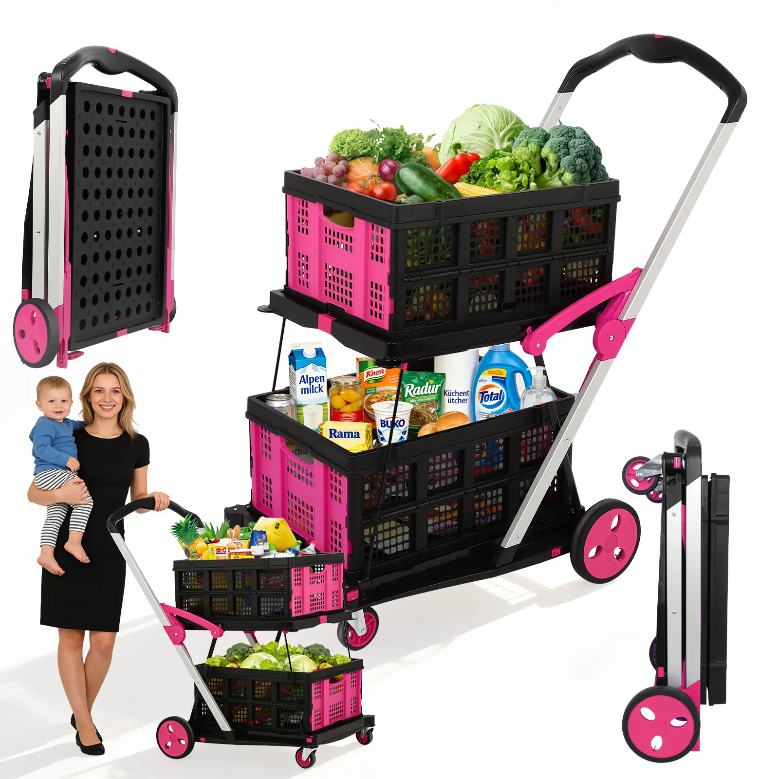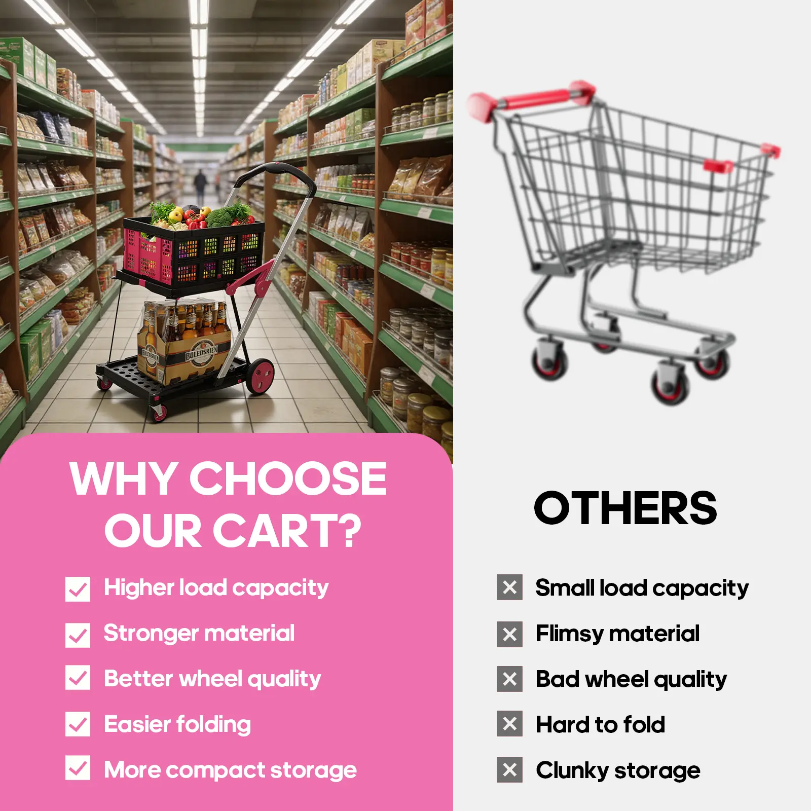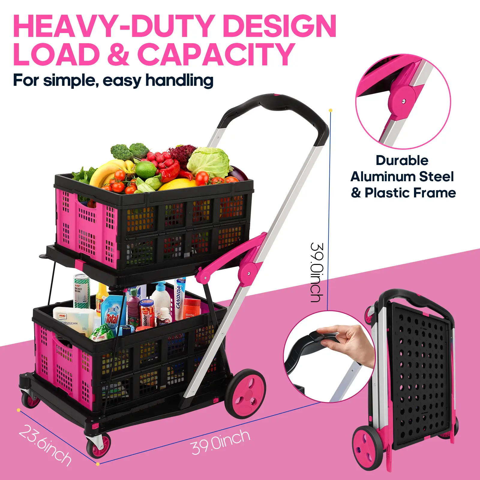 The quality surprised me in the best way—it handles heavy loads without wobbling, and the wheels roll smoothly on different surfaces. It’s lightweight but strong, easy to fold, and perfect for groceries, laundry, or everyday errands. Definitely worth the purchase.”