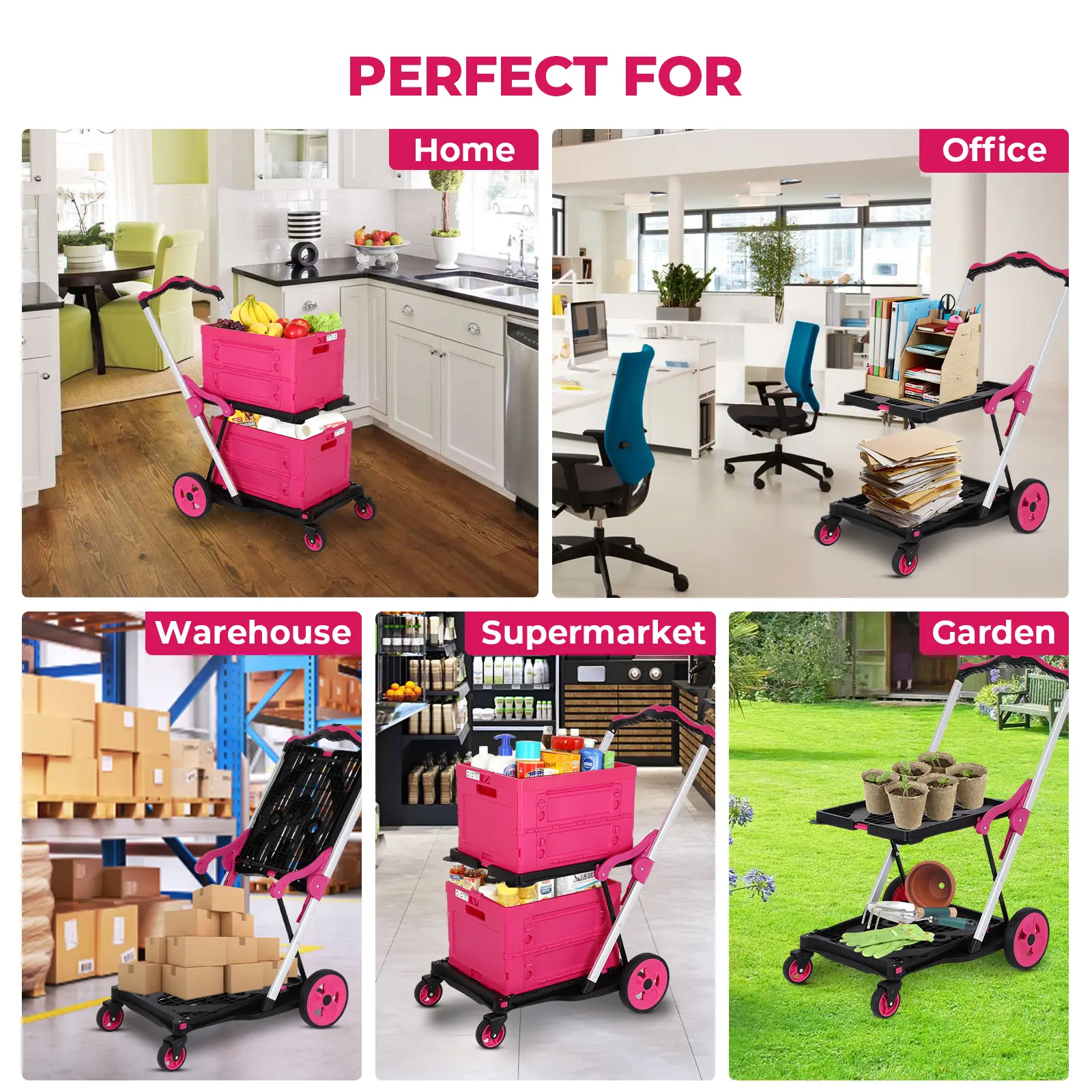 ·EASY INSTALLATION: Installing the cart is very simple. Simply insert the four wheels into the corresponding catches, press the handle button and lift the handle. The shopping cart can be easily adapted to a variety of situations, making lifting tasks much easier