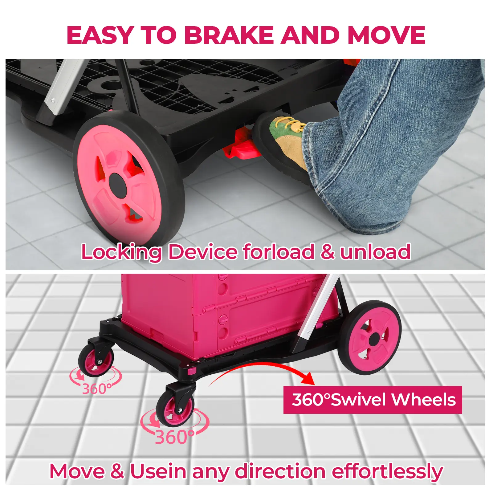 ·CONTROL AND BRAKING: Our multi-purpose carts are equipped with 360° swivel front wheels and large wear-resistant, non-slip rear wheelsets. This wheel set makes it suitable for most uneven surfaces.To immobilize, simply press the brake pedal and the wheelset locks securely in place