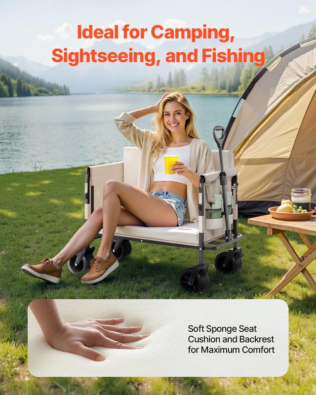 ·Multi-Functional Design: This foldable wagon cart is ideal for hauling heavy items and can instantly convert to a comfortable sofa! The side-opening design with a high-elasticity foam cushion allows the beach cart to quickly expand into a 75cm wide sofa. Whether you’re camping, vending, or hosting family gatherings, enjoy your break without the need to carry an extra seat, saving you effort and space.