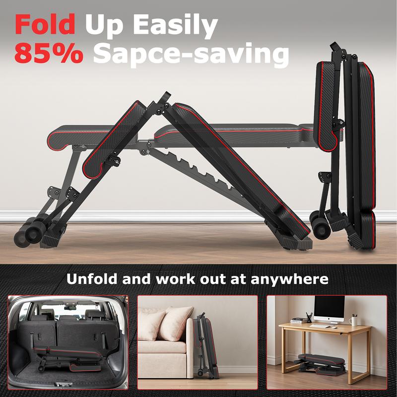 Foldable Design: The bench features a quick-fold system that allows for easy folding and unfolding, transforming your workout area into a clutter-free space when not in use. The compact folded size makes it convenient to store in a closet or under the bed.