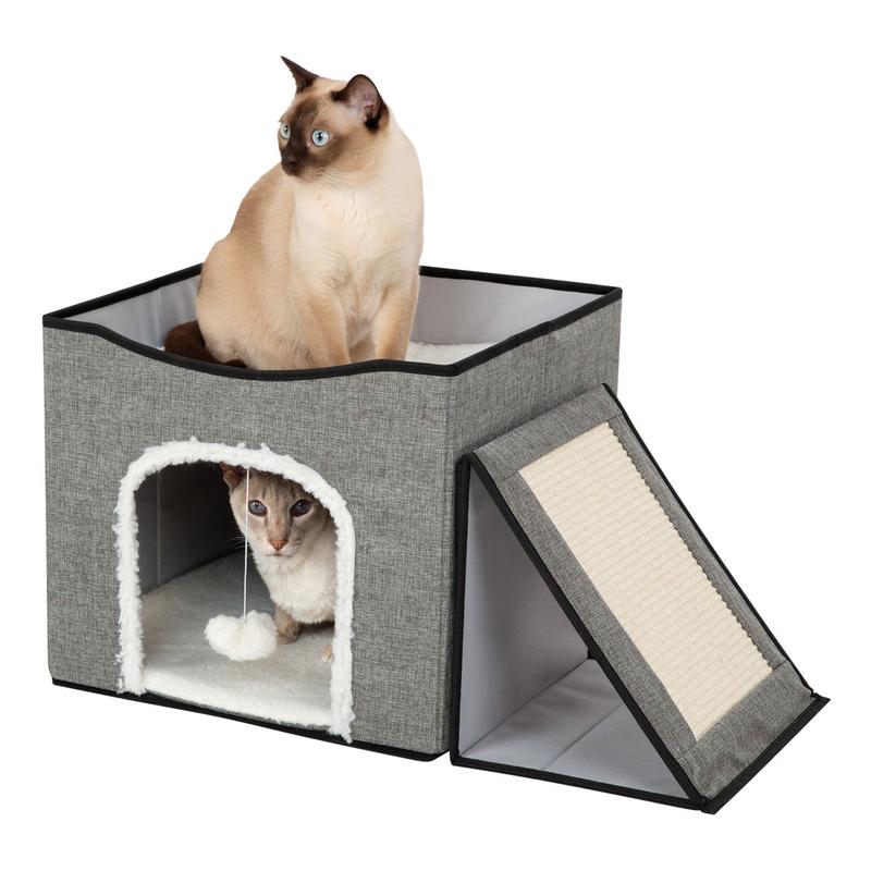 Pamper your feline friend with this foldaway cat condo, designed to offer ultimate entertainment and comfort. It provides hours of playful fun and a large scratch post to keep claws in top shape while protecting your furniture and carpets. From Etna.
