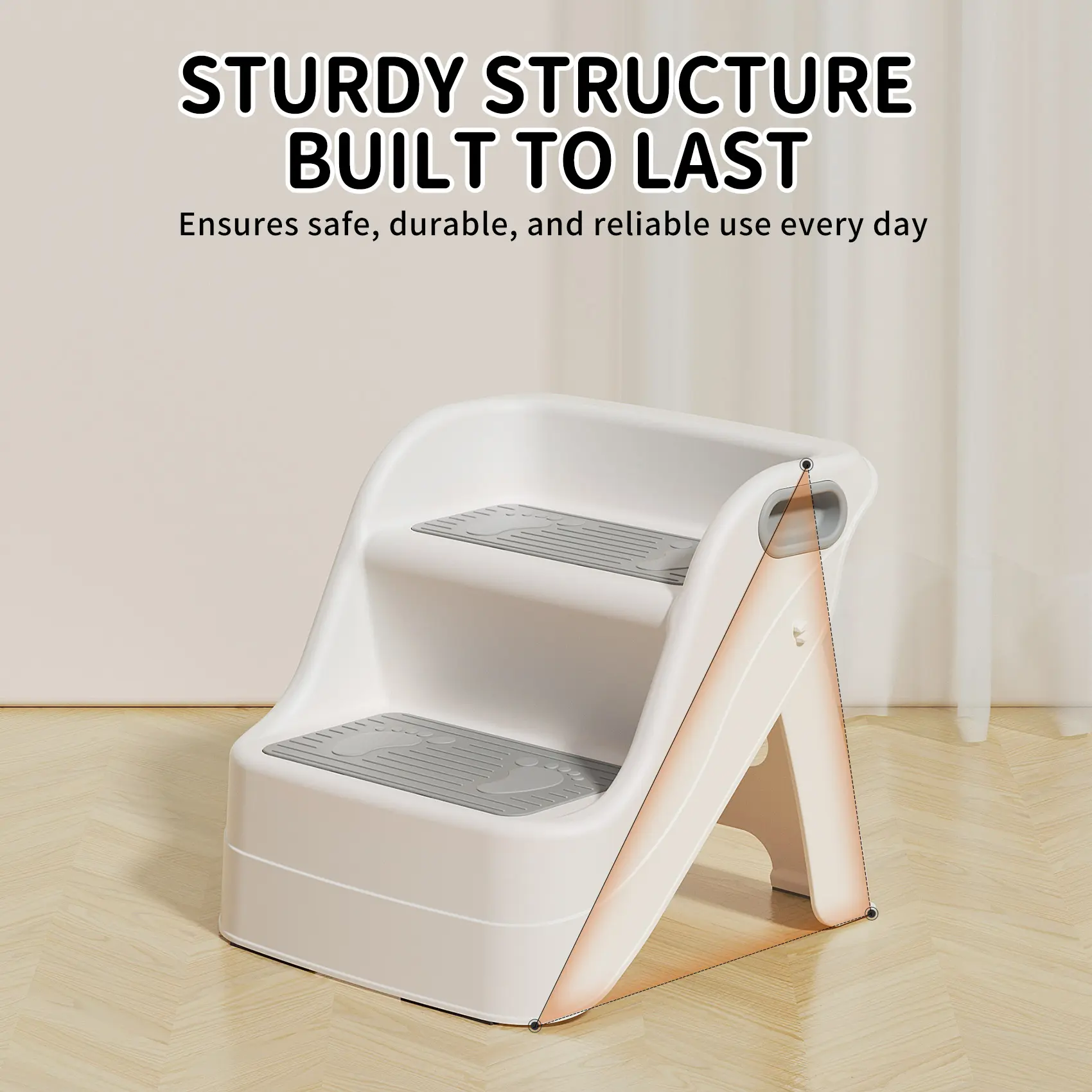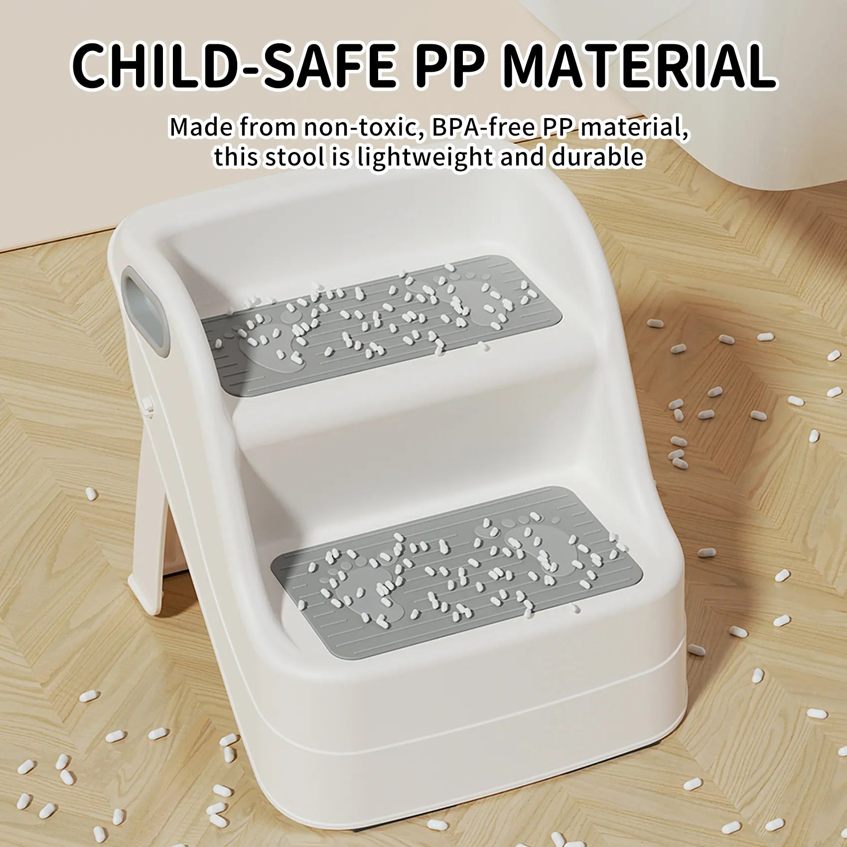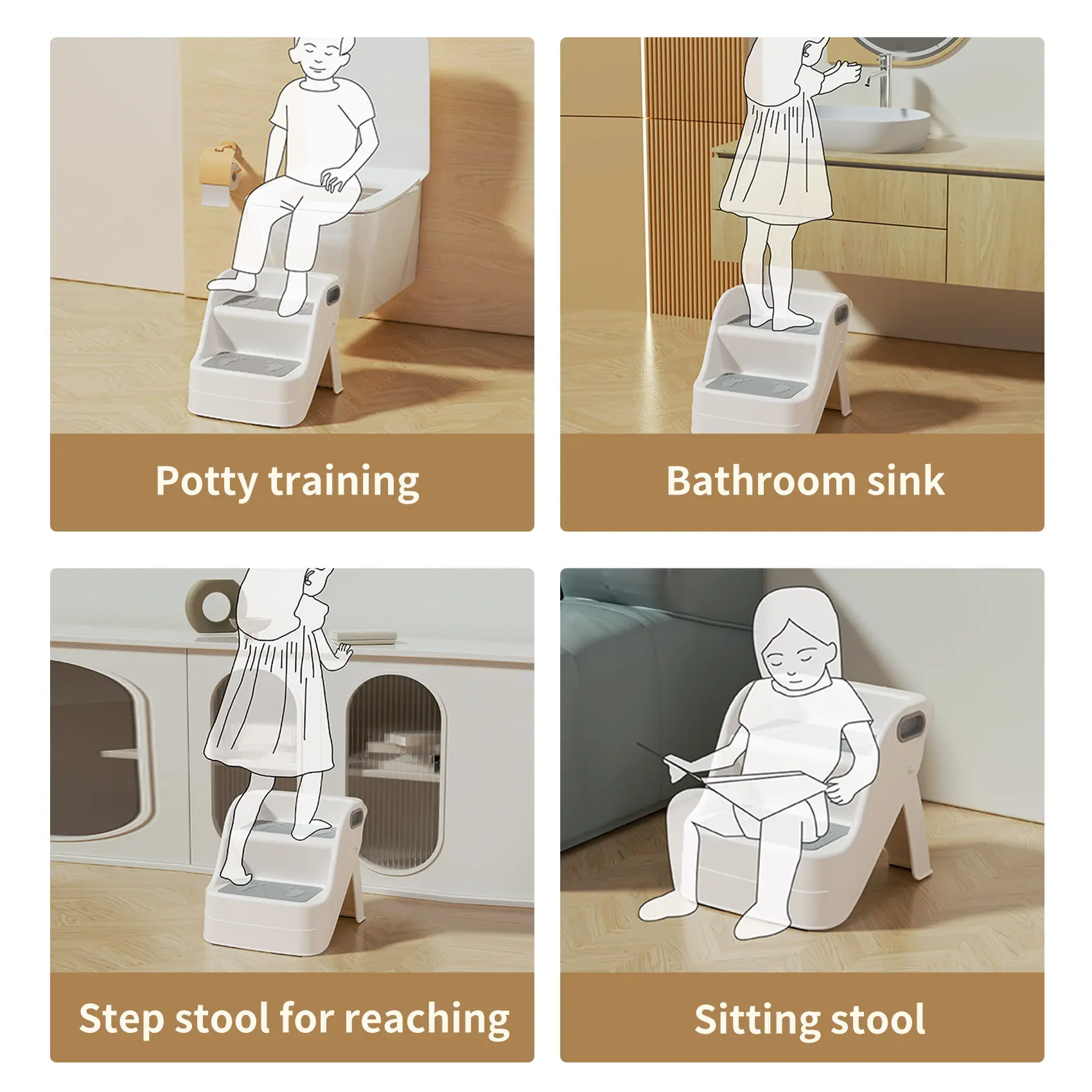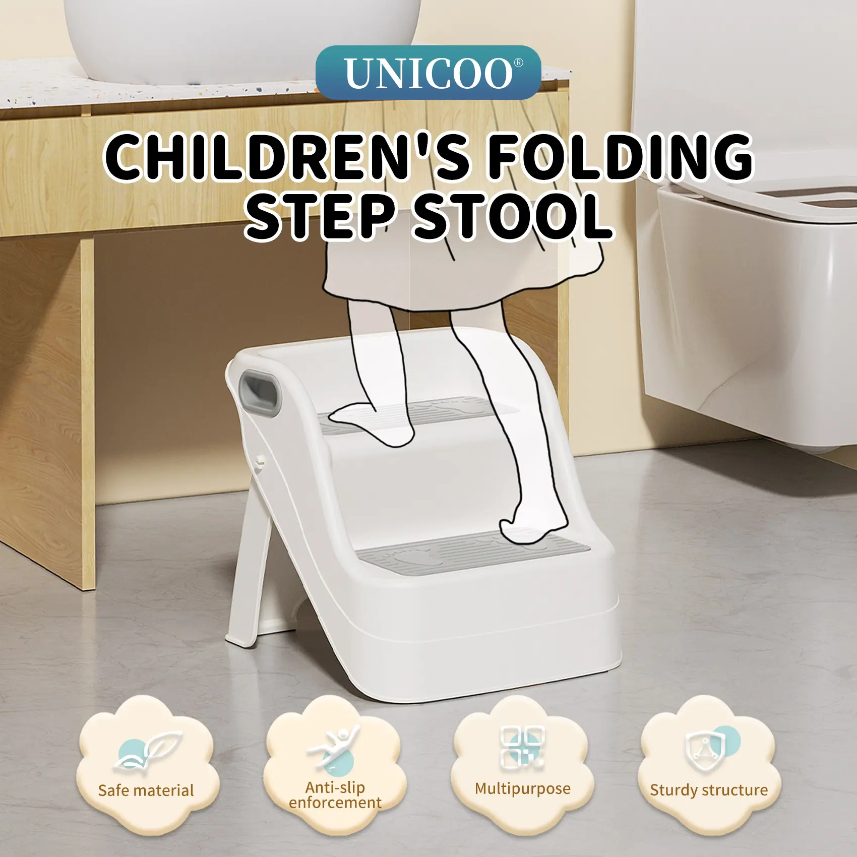 ·Built for Safety & StabilityWith anti-slip steps, grippy rubber caps, and a secure A-frame design, your child can step up confidently. Whether they’re potty training or reaching the bathroom sink, this stool stands firm—no wobbling, no slipping.
