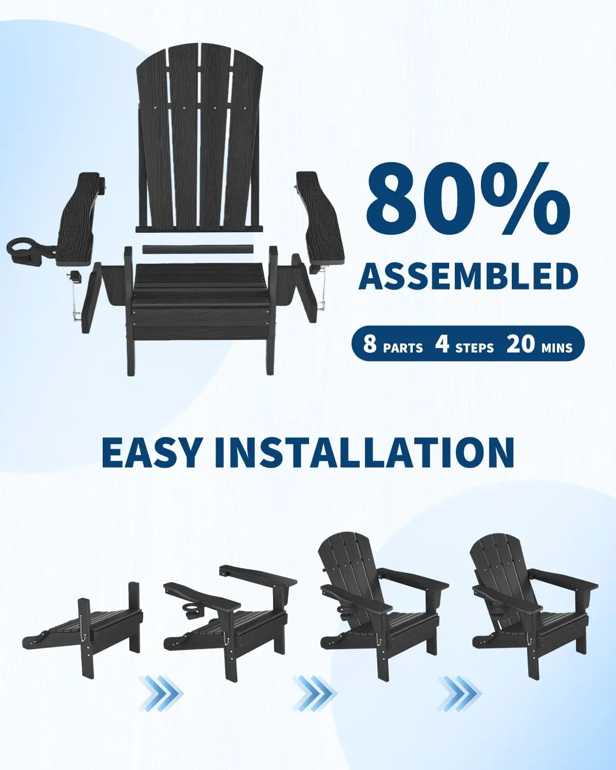 【All-Weather & Heavy-Duty Support】Built to endure the elements, this HDPE Adirondack chair requires no maintenance. Its reinforced frame provides strong support with a weight capacity of 380 lbs, ensuring reliable stability as fire pit chairs or patio seating.
