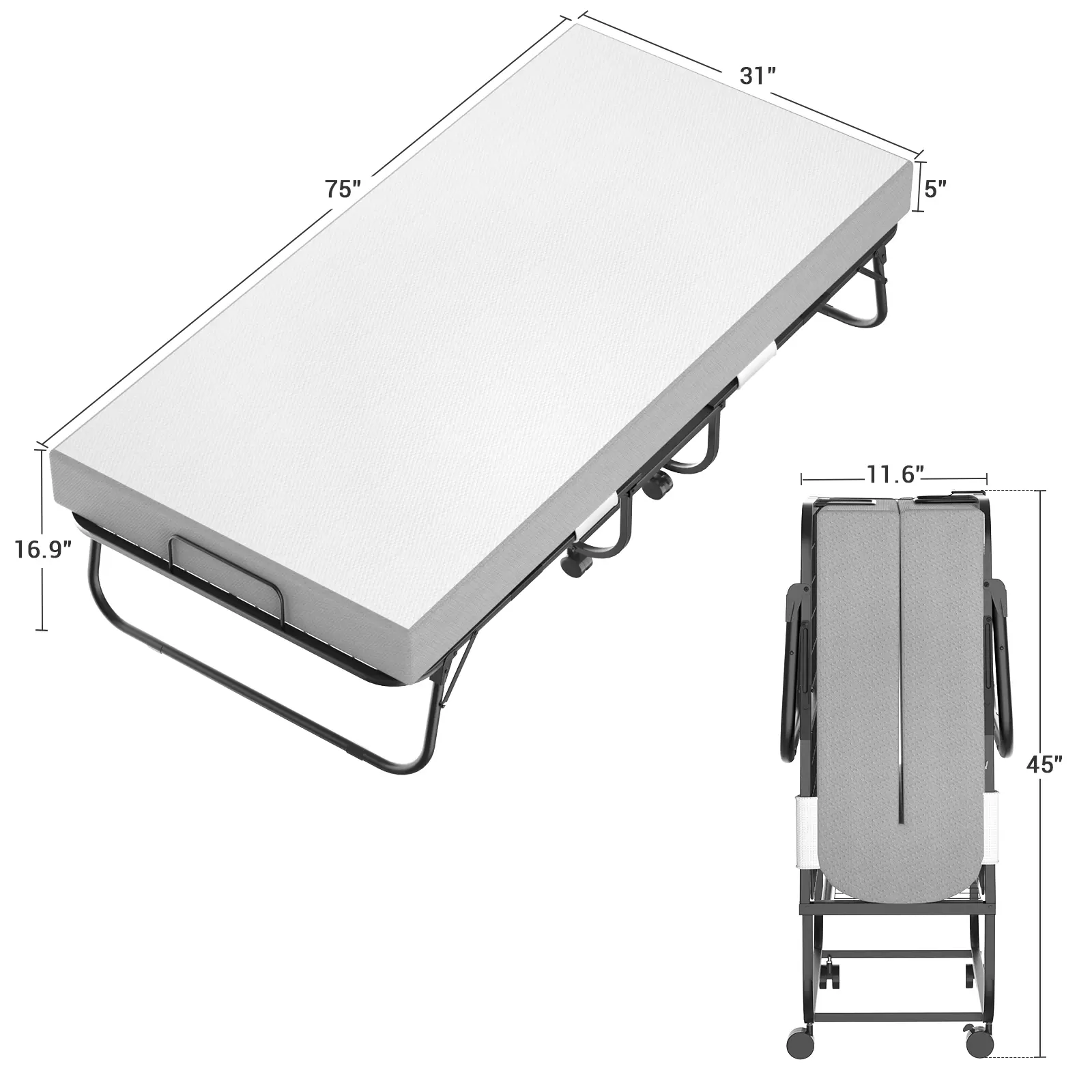 ·【Foldable Design & Space-Saving】The folding bed can be folded in simple steps by one person at any time. It measures only a slim 12.8" thick when you fold it. Designed in a compact size, the portable bed can save space and is easy to store in the corner after folding. Folded dimensions: 31"W x 11.6"D x 45"H - Open Dimensions: 31"W x 75"D x 16.9"H.