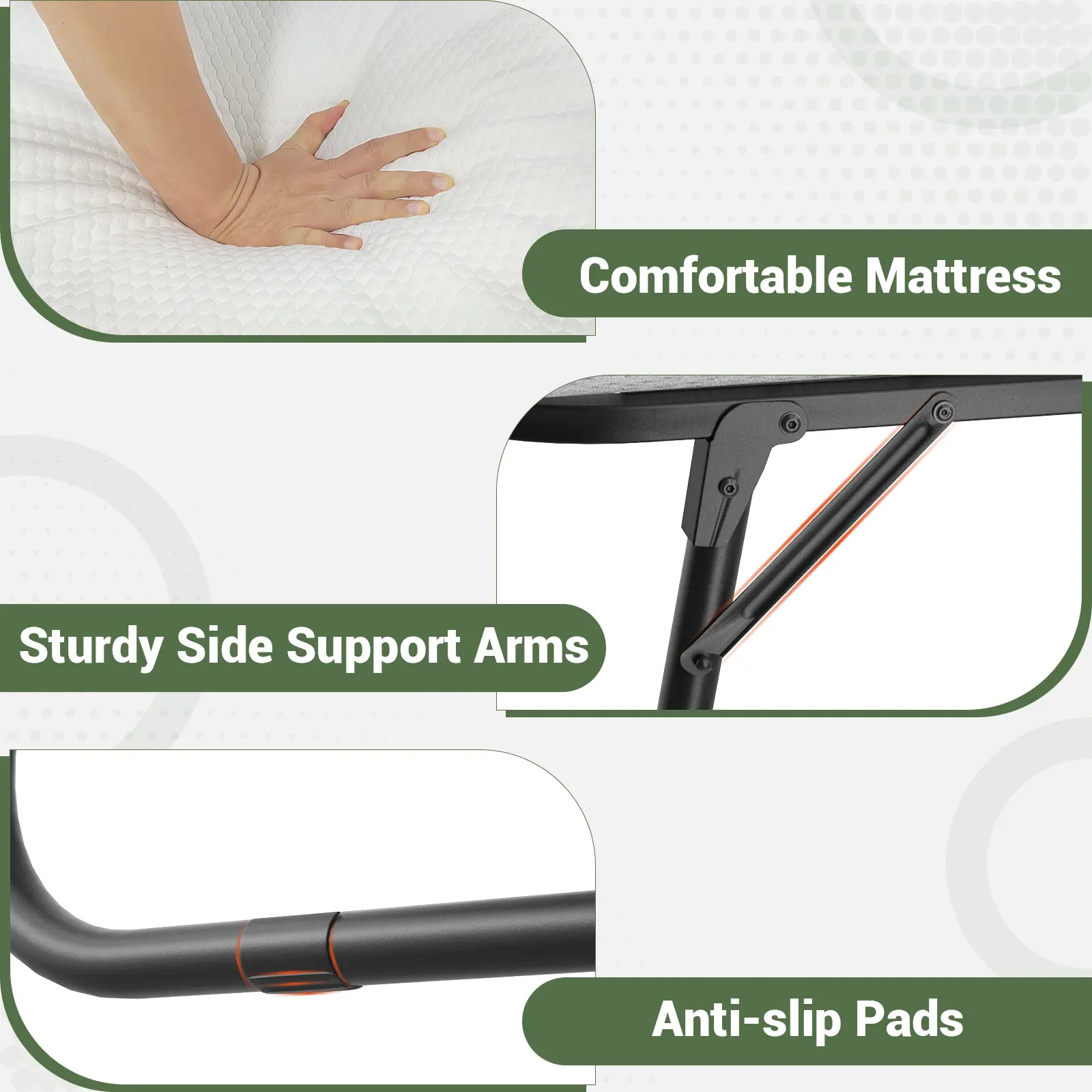 ·️【Sturdy & Durable】Build with a high-quality steel frame and reinforced structure, this rollaway bed has good stability and strong load-bearing capacity, bearing a maximum load of 300 lbs. The powder-coated surface features medium rust and scratch resistance for long-term use.