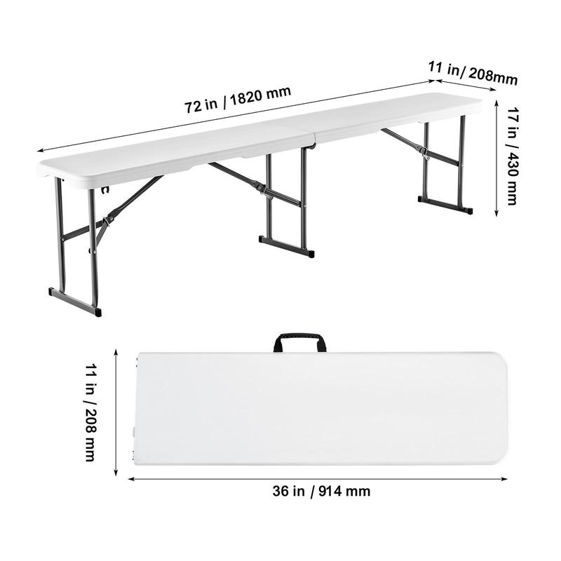 • Comfortable Seating: This 72x11x17 inch / 1820x280x430 mm (1-piece ) 6FT folding bench is highly portable and lightweight, providing comfortable seating with no assembly required. Simply unpack and use.