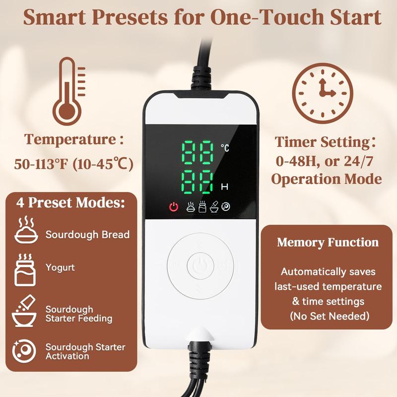 ·Intelligent Design: Audible Alert for Preheat/Fermentation Completion: Beeps for 10 seconds, Beep reminder (10 sec) every 3 mins until you press "+" key or turn off. Memory Function: Automatically saves last-used temperature & time settings (No reset needed)