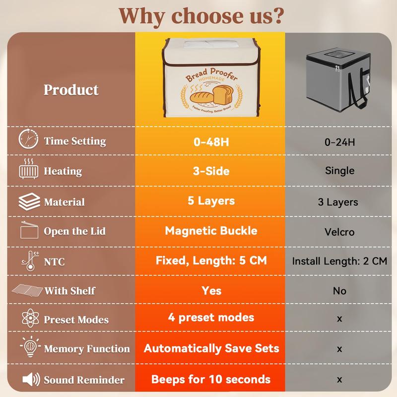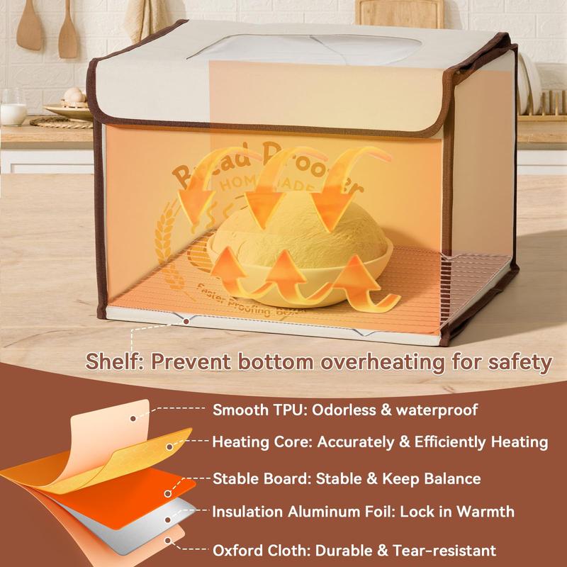 ·3-side Heating Fermentation Box: There are 3 heating zones: front, back and bottom for even and rapid warming, bread proofing box surrounded by heating wires that creat an efficient and ideal fermentation facility, and satisfy all types of fermentation needs, suit for making Bread, Pizza, Yogurt, Natto, Handmade Soap, etc
