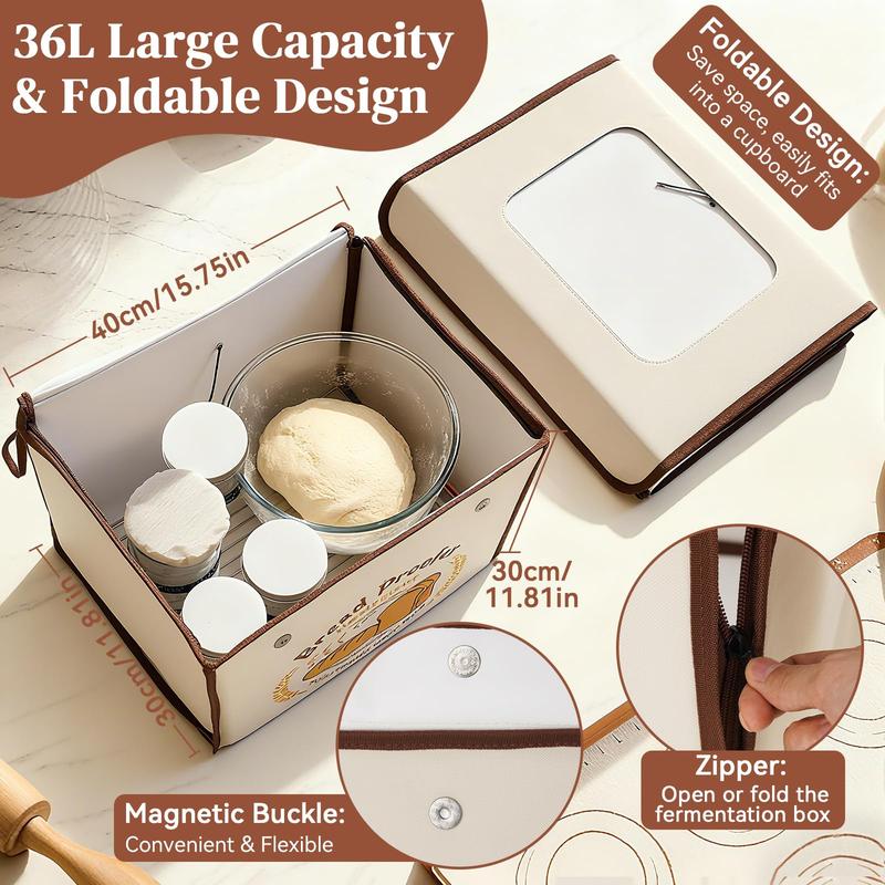 ·Foldable & Easy to Storage: Bread proofing box is foldable with zipper-opening, and flexible to storage and save space, easily fits into a cupboard. Unfolds into a large capacity dough proofing box, Size is 15.75 x 11.8 x 11.8 inches, the capacity is 36L, fits multiple dough bowls, sourdough loaves, or yogurt jars, and large viewing window for observing the fermentation
