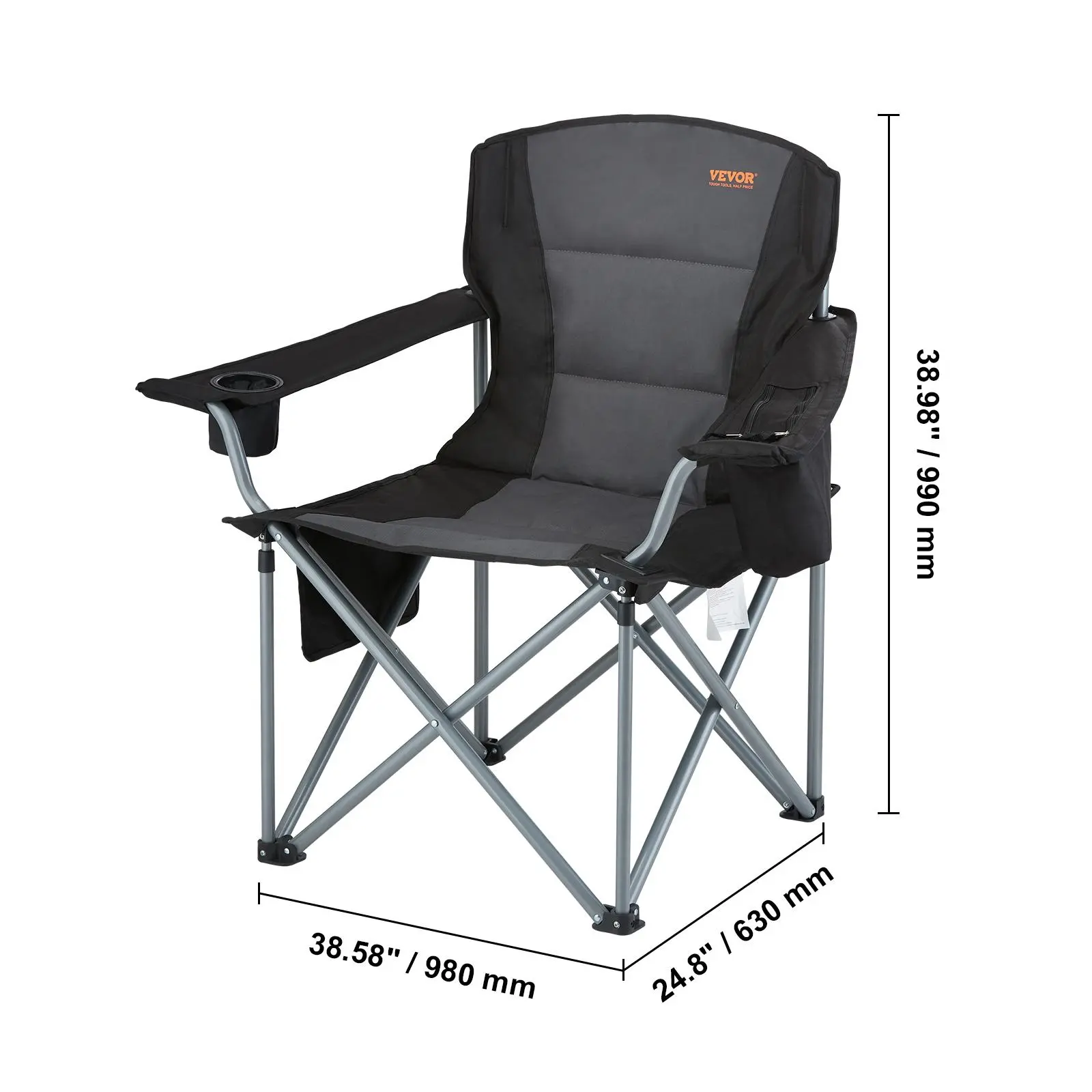 5. VEVOR Camping Folding Chair for Adults, Portable Heavy Duty Outdoor Quad Lumbar Back Padded Arm Chairs with Side Pockets, Cup Holder and Cooler Bag for Beach, Lawn, Picnic, Fishing, Backpacking, Black