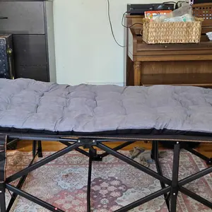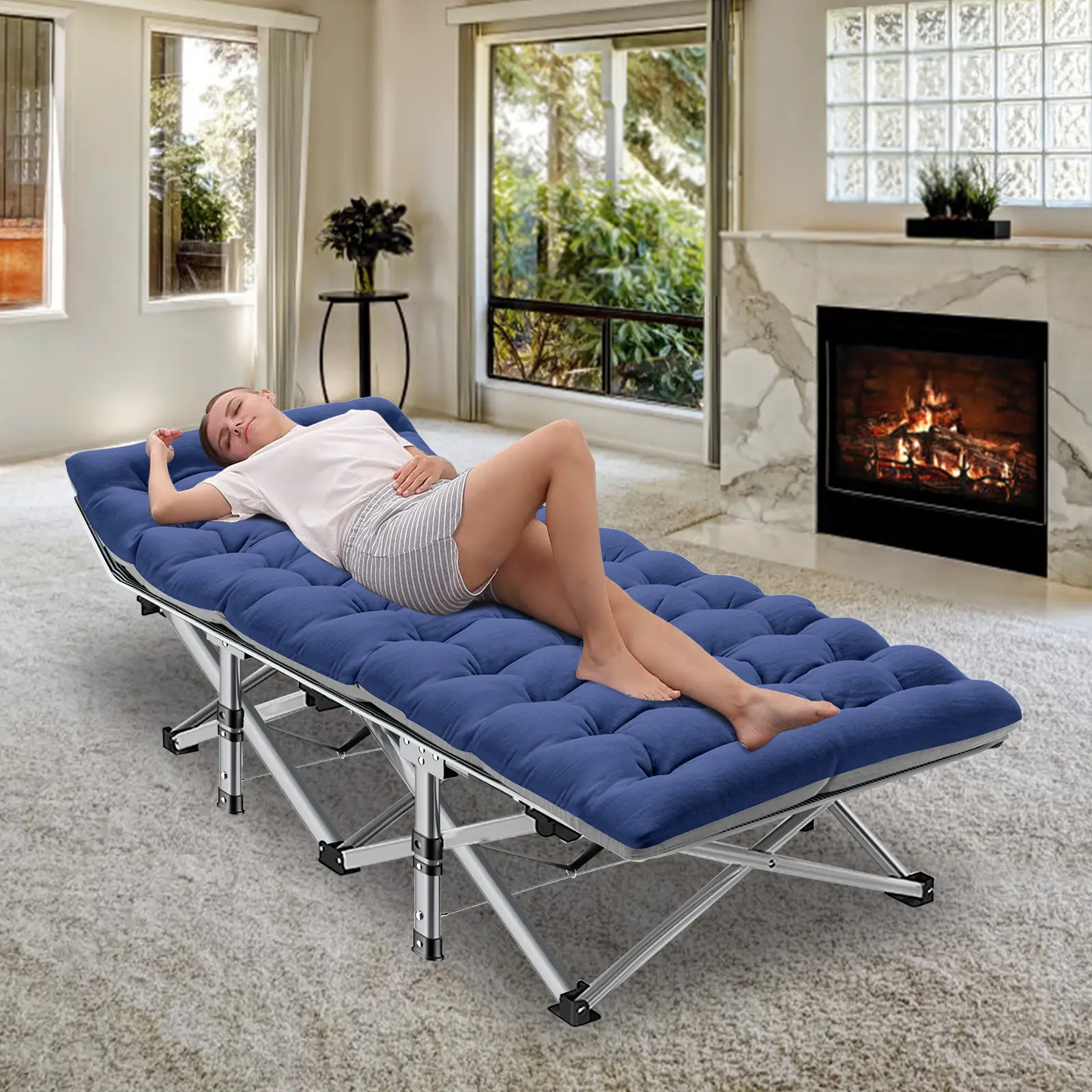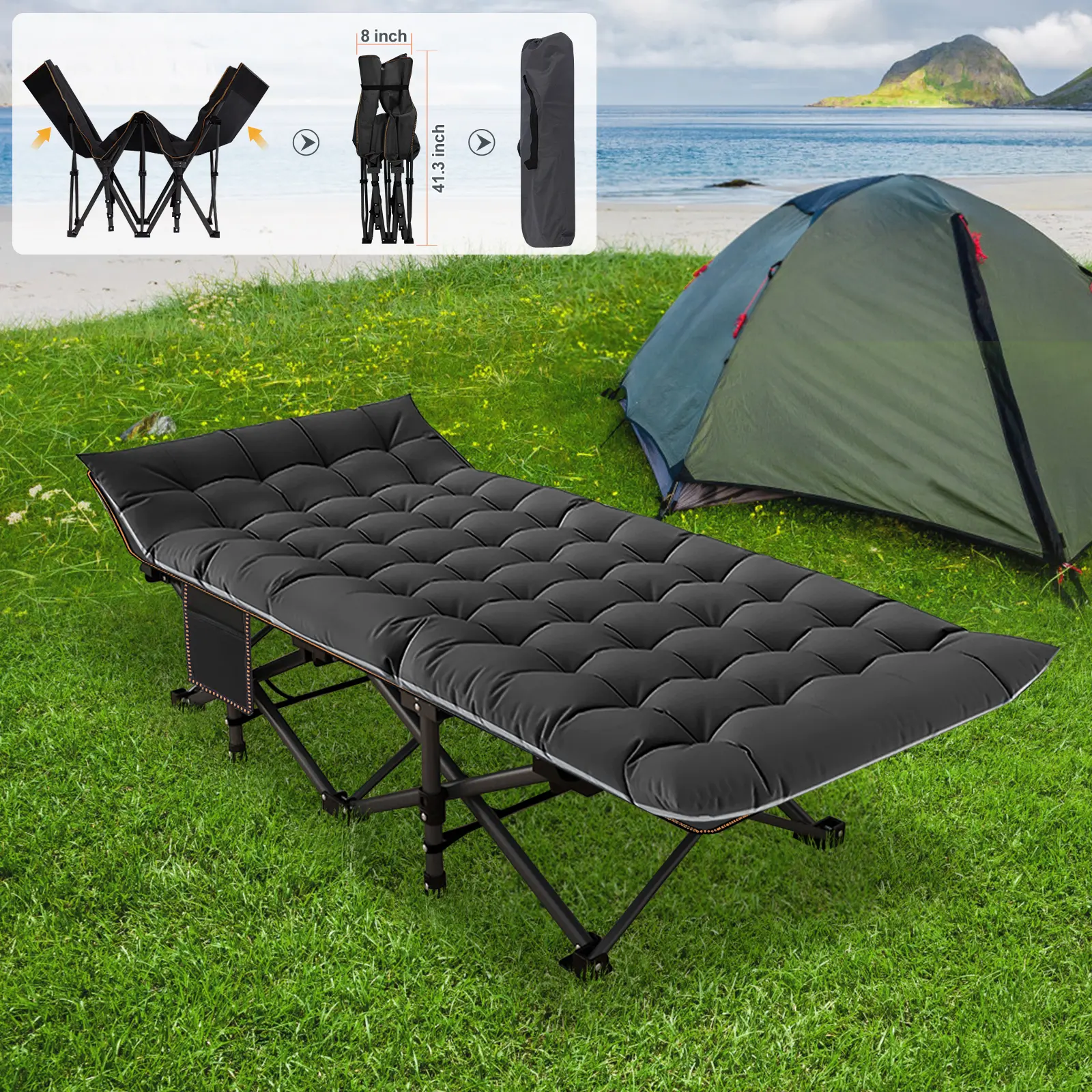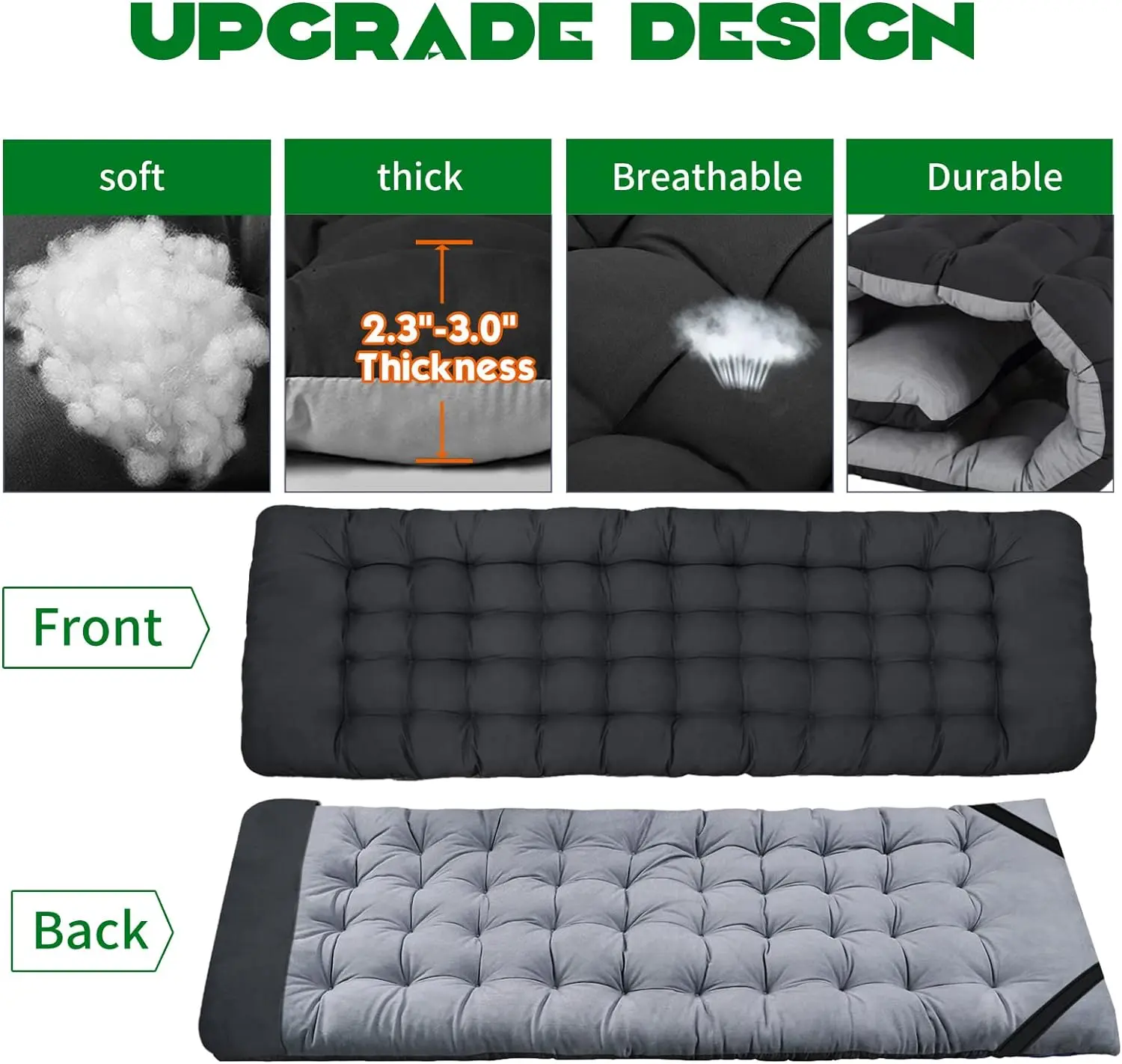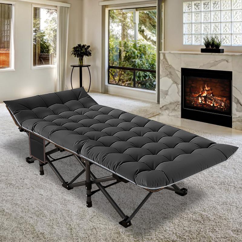 2 Sided Comfortable Mattress: Equipped with 2 Sided Mattress, Reversible Cushion, you can sleep more comfortably in this portable folding camping bed. In hot weather, the cushion can also be taken away for the breathable. 3.3 inch thickened pearl cotton pad (keep warm in autumn and winter).