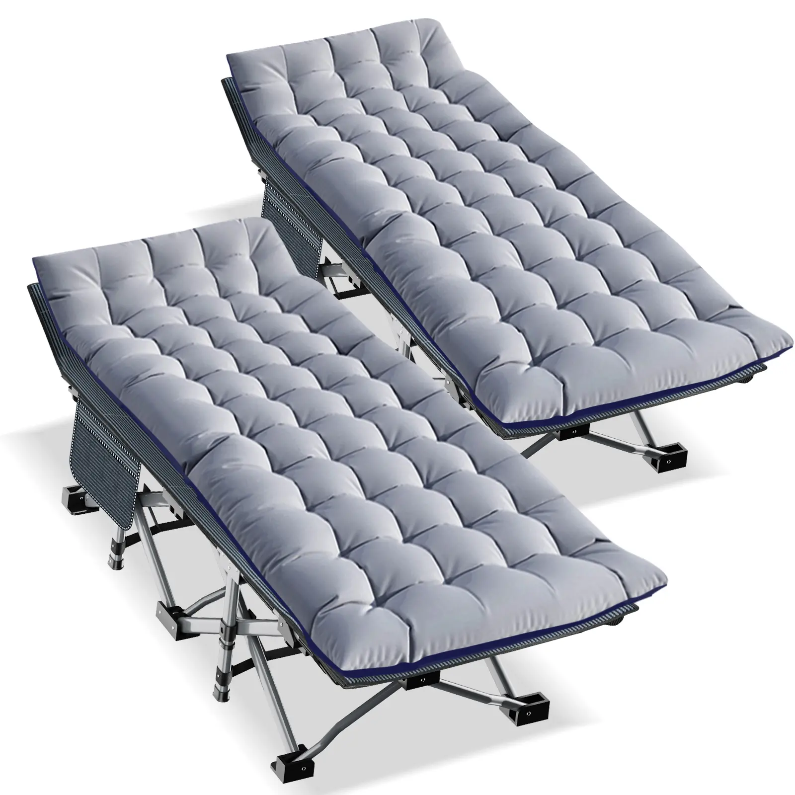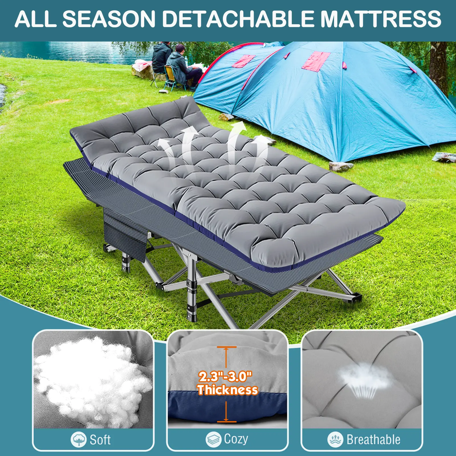【With 2 Sided Cotton Mattress 】: Equipped with 2 Sided Mattress, you can sleep more comfortably in this portable folding camping bed. In hot weather, the cushion can also be taken away for the breathable. 3.3 inch thickened cotton pad (keep warm in autumn and winter).