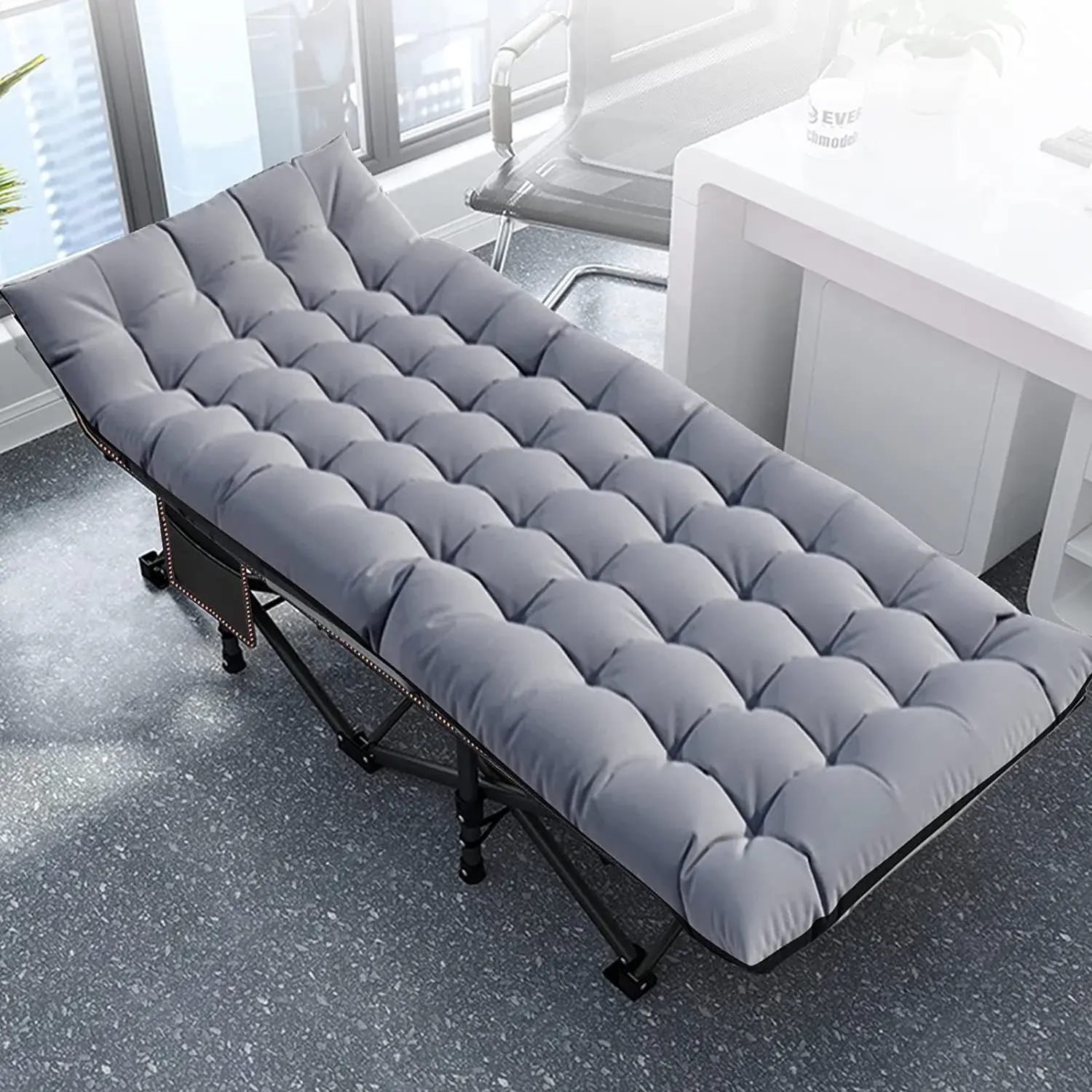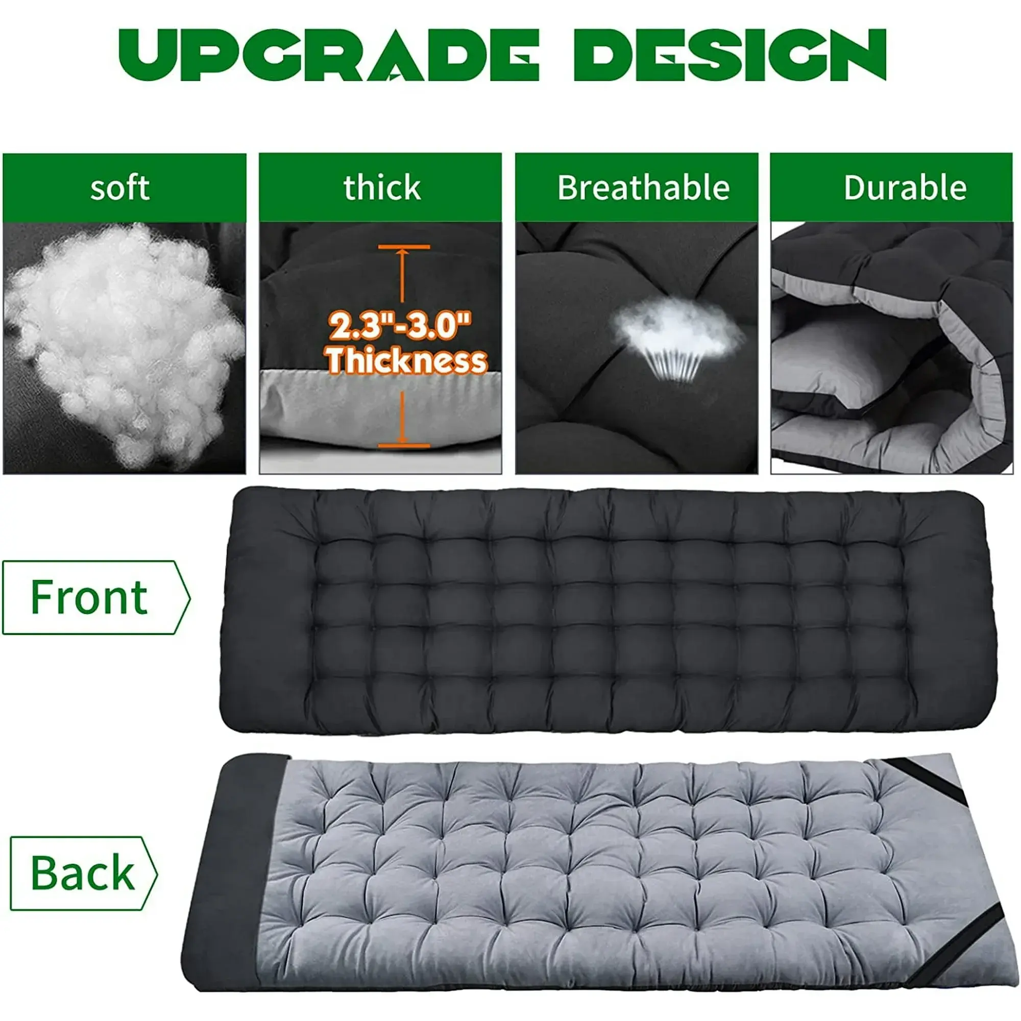 2 Sided Comfortable Mattress: Equipped with 2 Sided Mattress, Reversible Cushion, you can sleep more comfortably in this portable folding camping bed. In hot weather, the cushion can also be taken away for the breathable. 3.3 inch thickened pearl cotton pad (keep warm in autumn and winter).