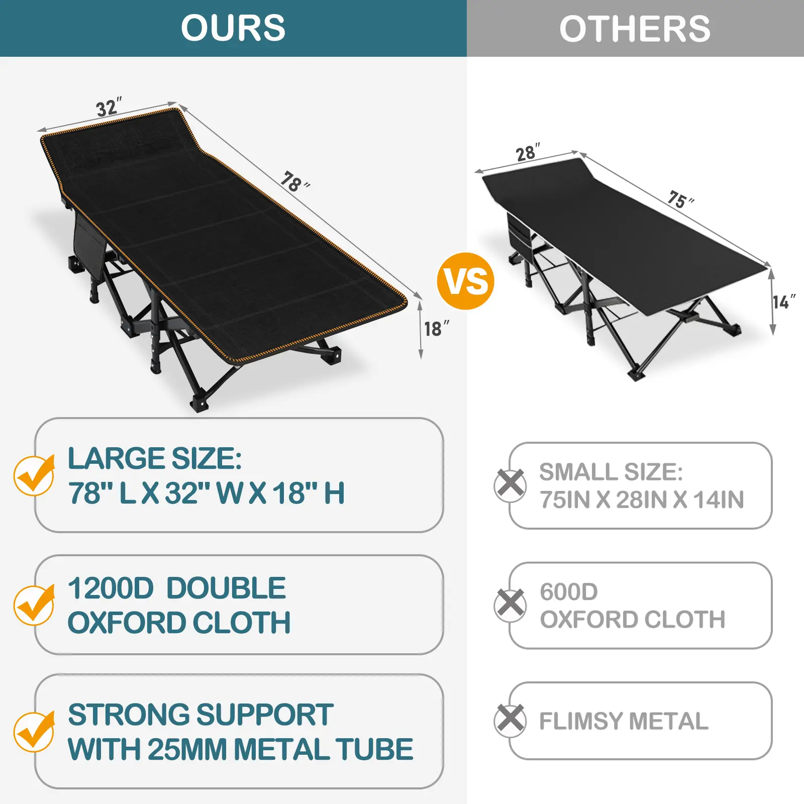 【 Premium Material 】 Slsy camping cot for adults is made of a square anti-rust steel frame, durable thicker pipe and double layer 1200D Oxford cloth. Most similar cots are only 600D Oxford cloth, ours are more durable to use, supports up to 900 lbs.