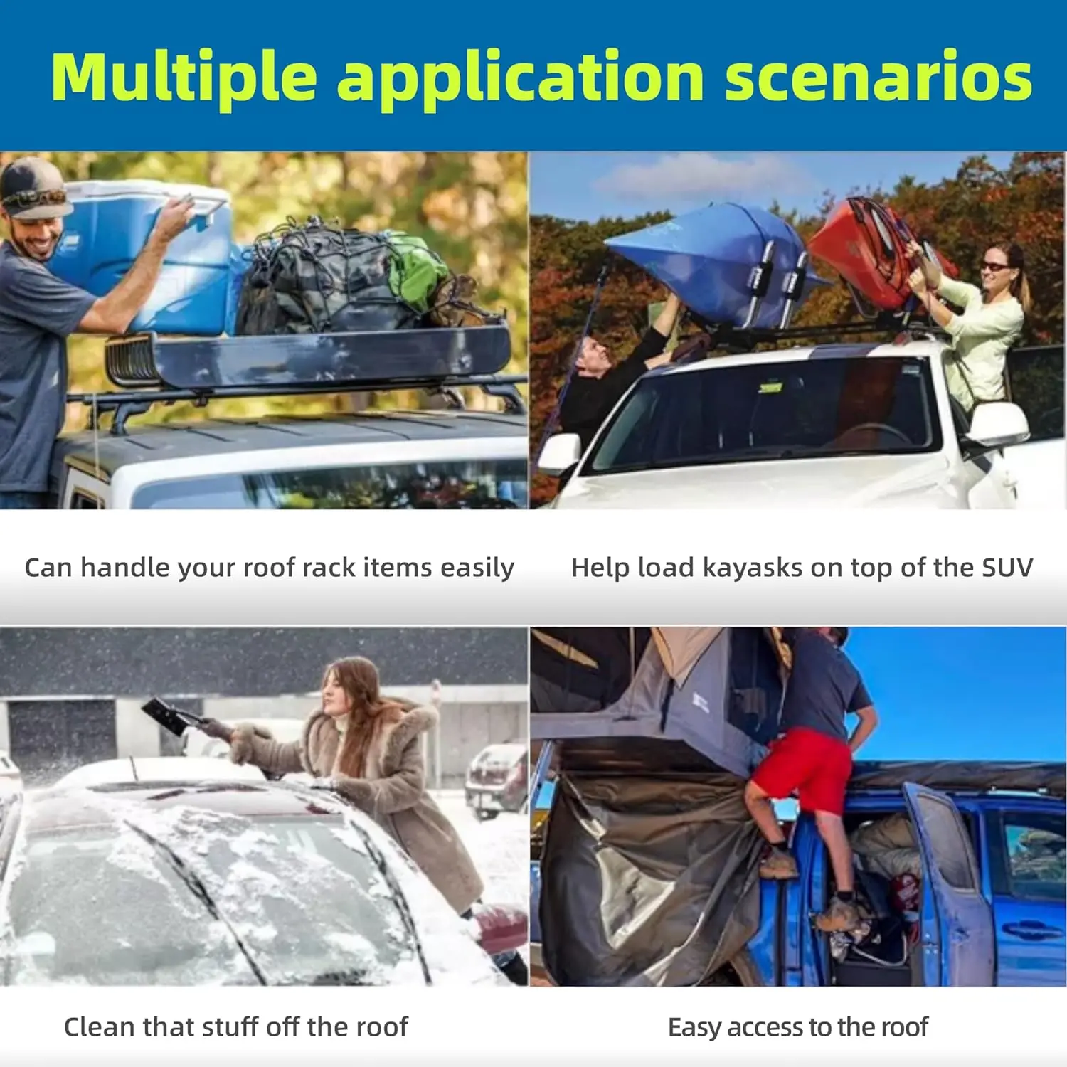 Easily reach your car roof rack, cargo box, or roof-mounted accessories with this durable foldable car step. Made of aluminum alloy, it supports a secure step for SUVs, trucks, and cars, making roof access safe, fast, and effortless.