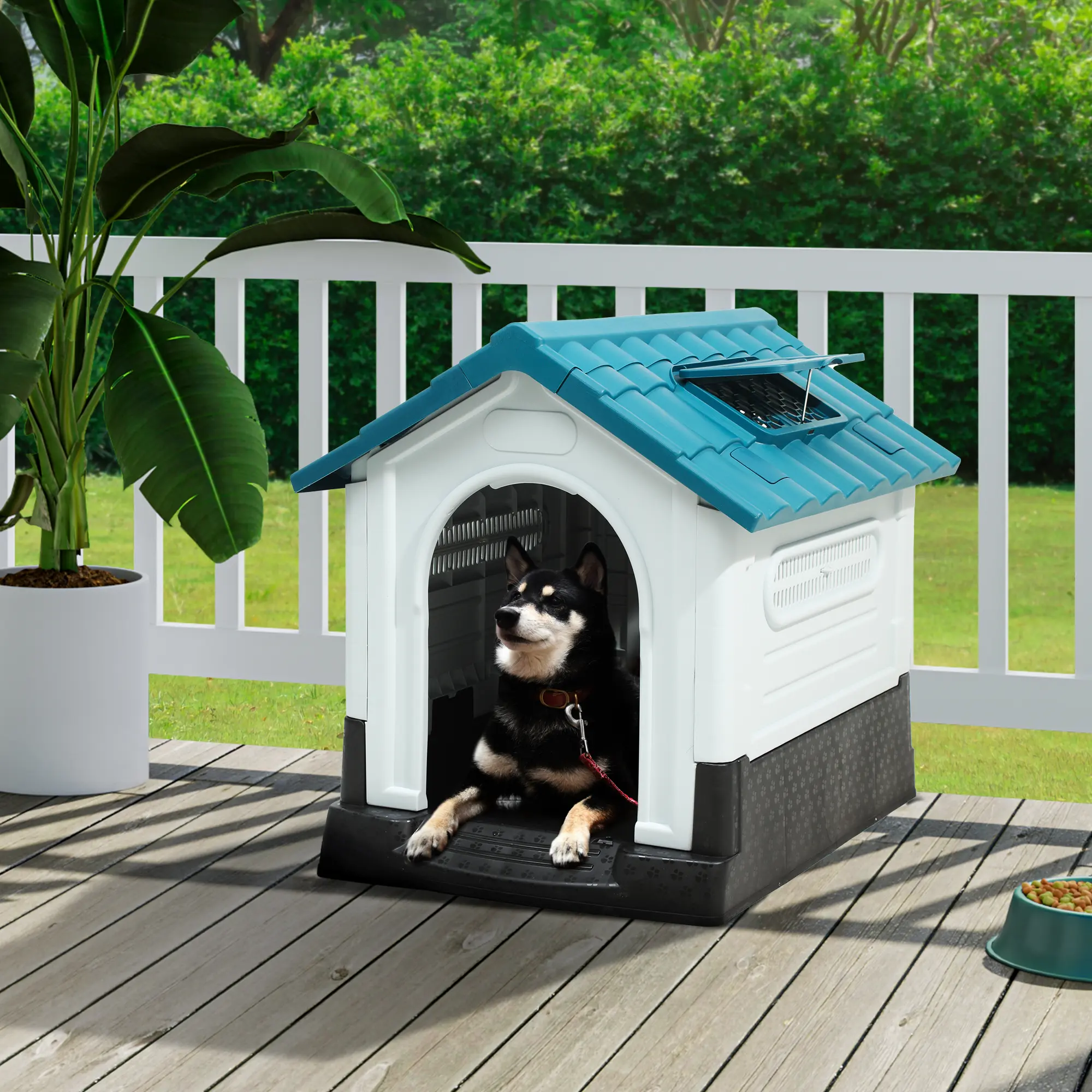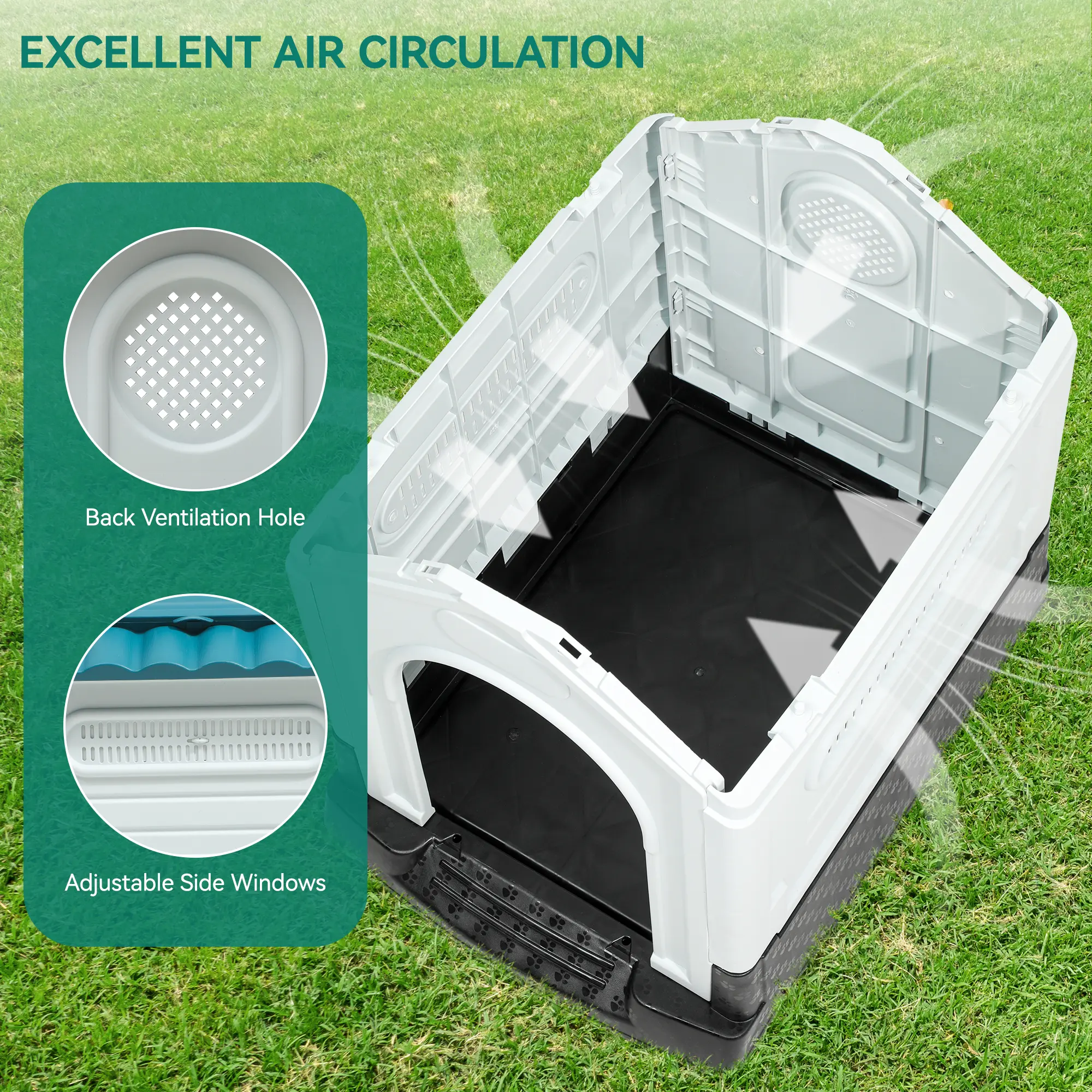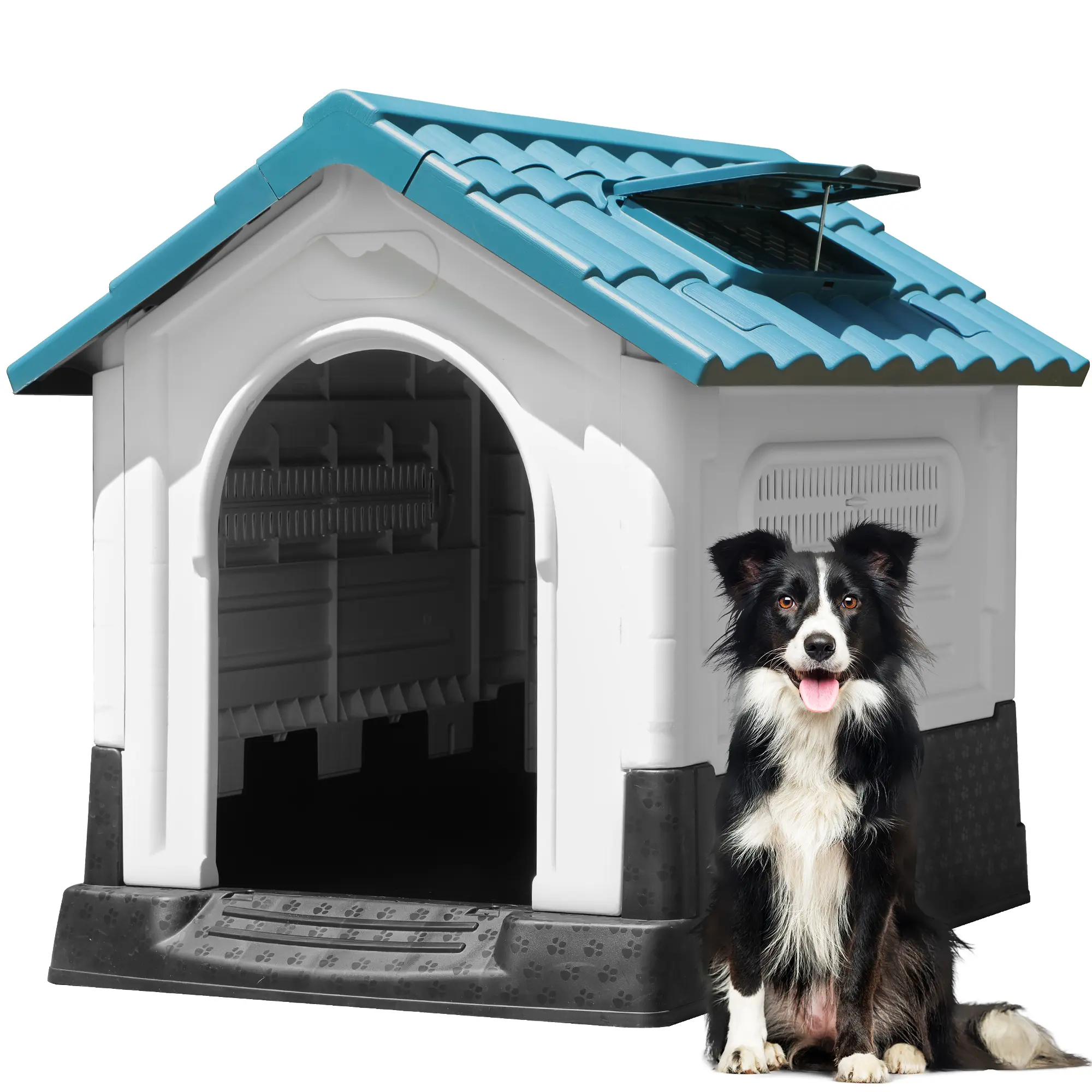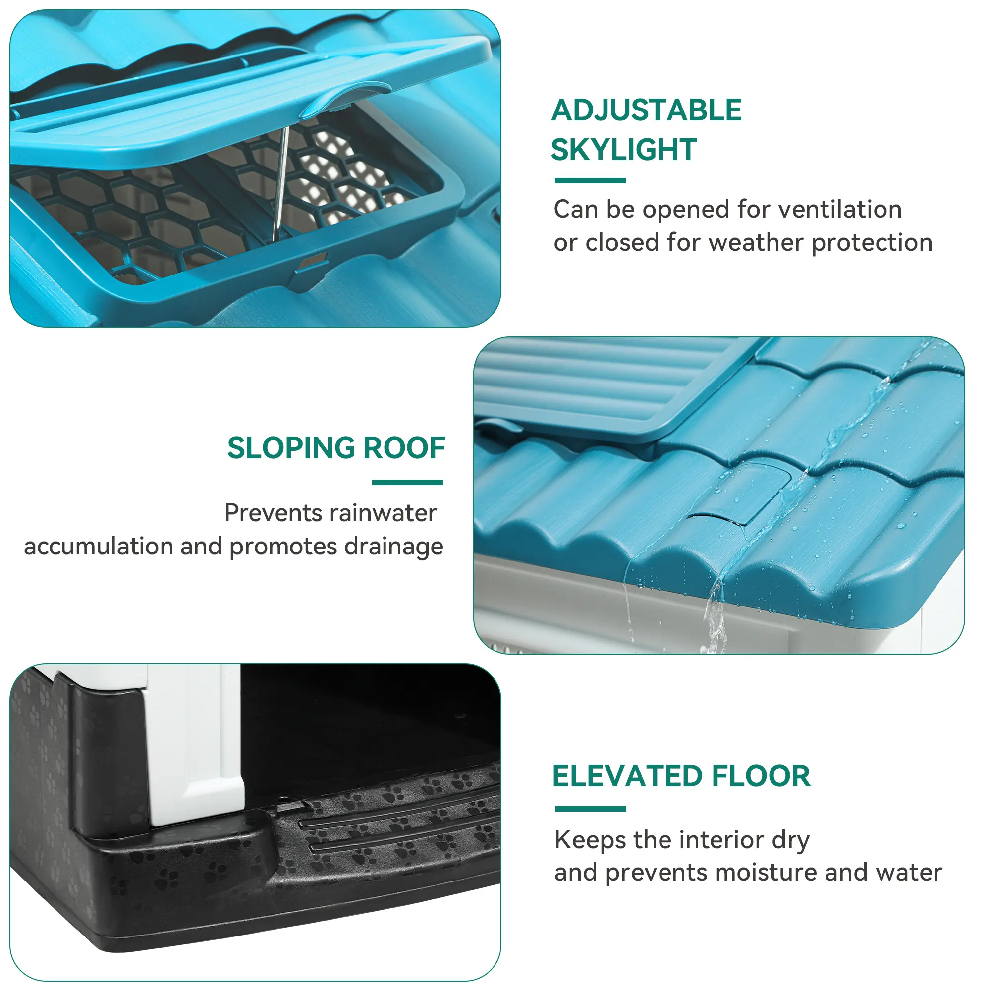 ·FUNCTIONAL DOGHOUSE- Dense layout and sloping roof prevents rainwater accumulation; Openable sunroof comes with side windows and back holes to achieve optimal ventilation when opened, and blocks out weather elements when closed; Elevated floor design is moisture resistant