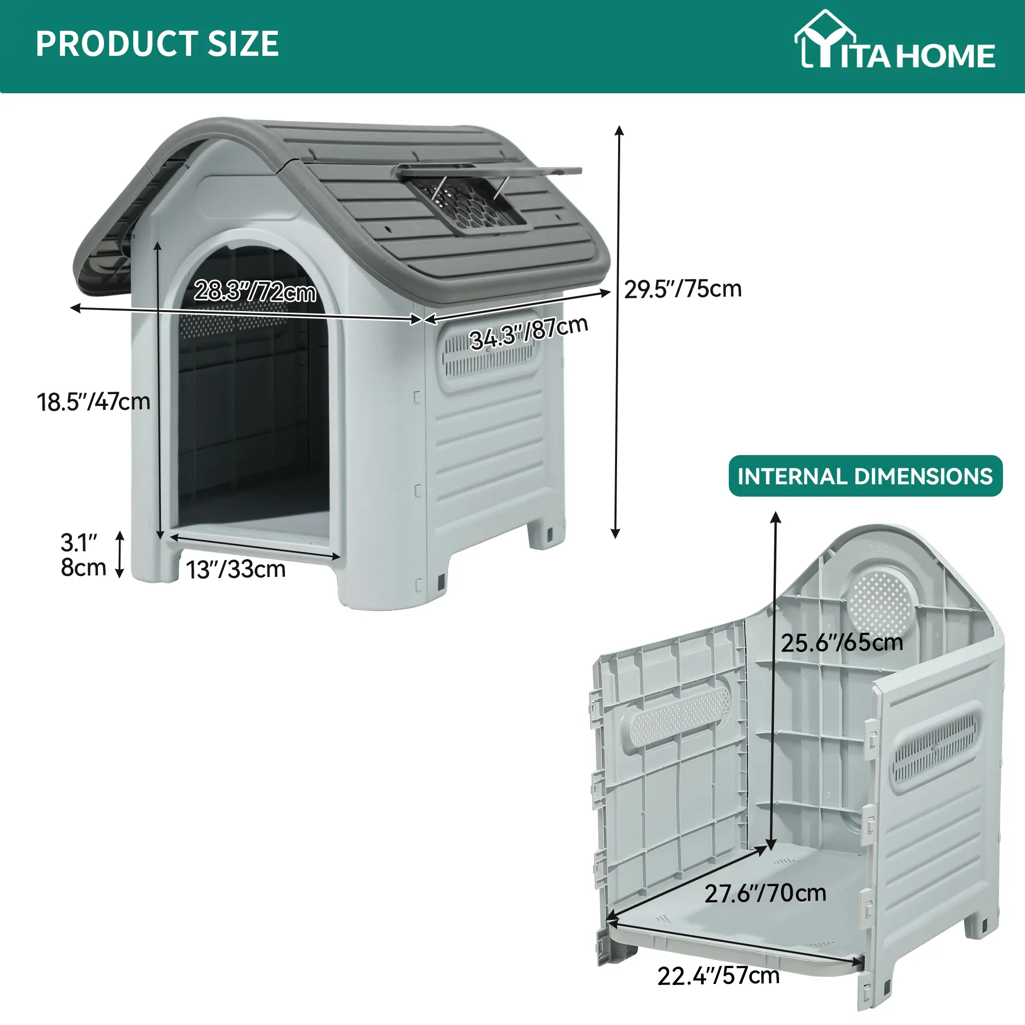 ·DOG HOUSE FOR MEDIUM CANINES- Measuring 33.1''L x 27.6''W x 30''H in size, with door dimensions of 18.9''W x 13'', this plastic dog house provides a spacious home for your French Bulldog, Corgi, etc