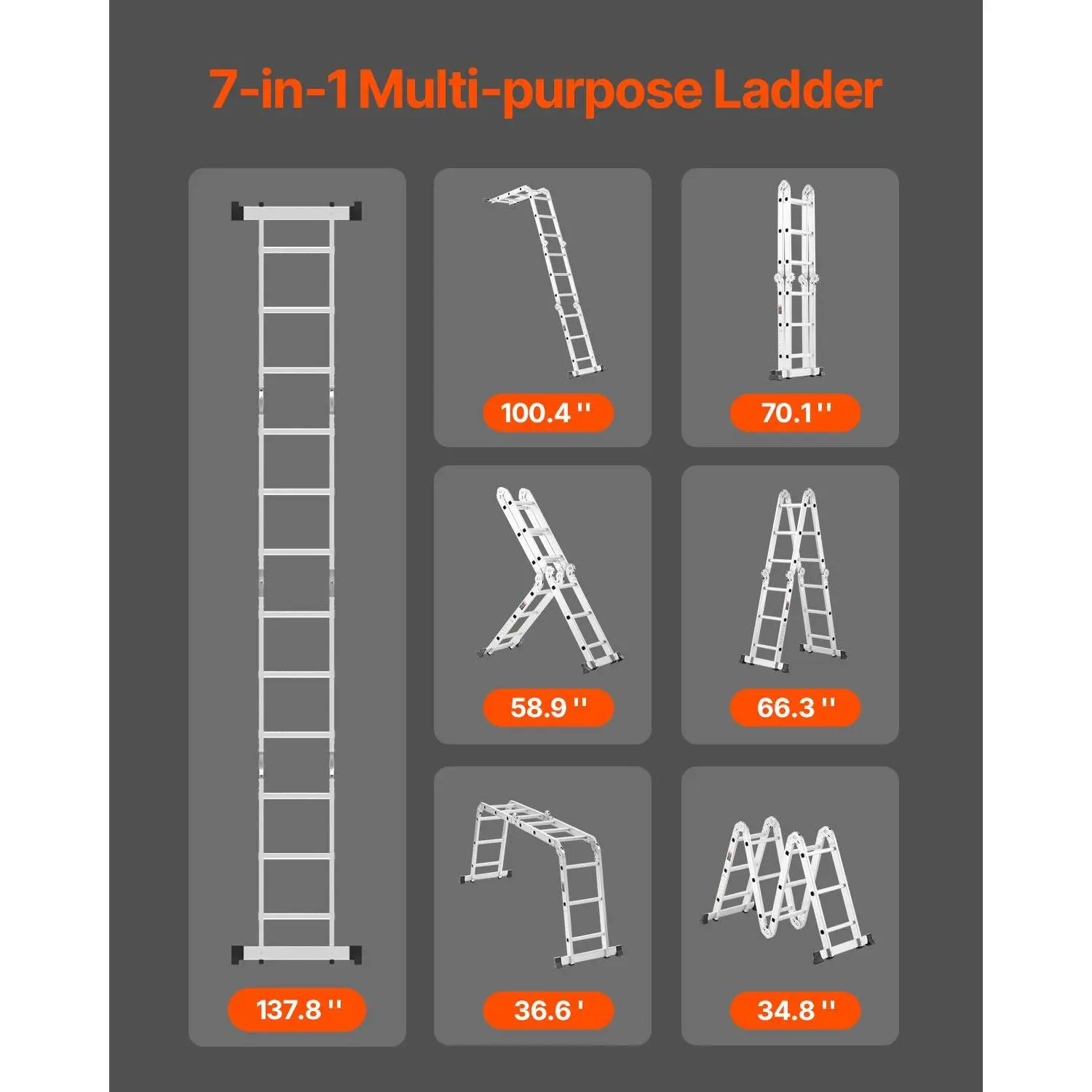 • 7-in-1 Versatility: This adjustable ladder can be easily folded into 7 different shapes: A-frame, M-frame, ladder, L-shape, platform, folded, and straight. It is perfect for various tasks such as house cleaning, maintenance, interior decoration, gardening, car washing, and more. It extends up to 137.8 inches, making it easy to reach rooftops or high places.