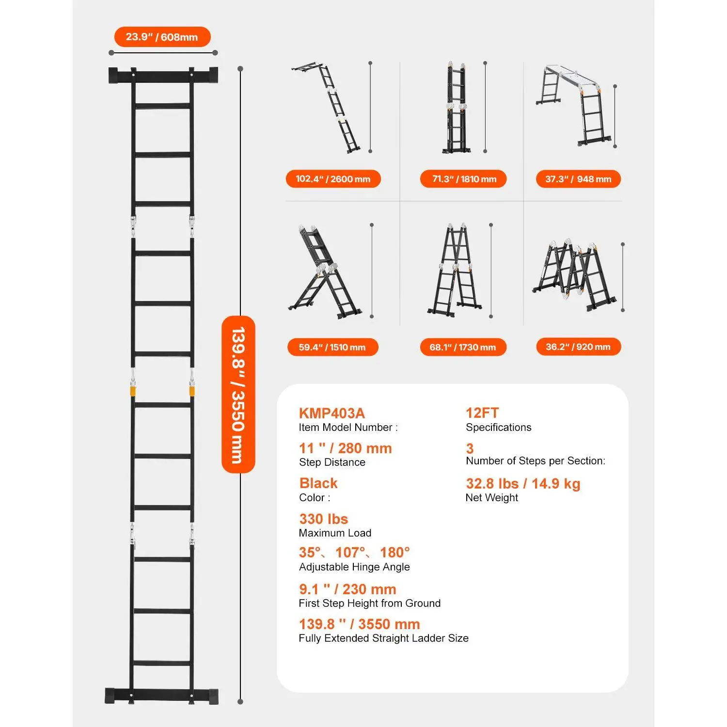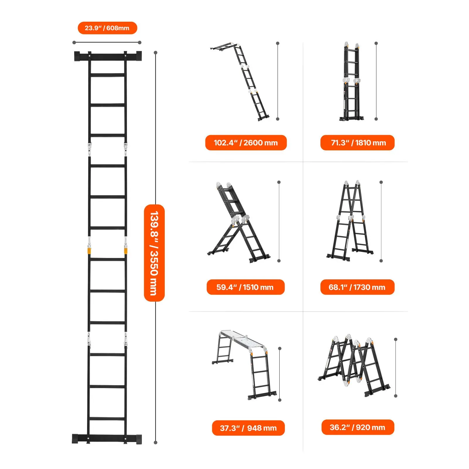 β’ 7-in-1 Versatility: This adjustable ladder can be folded into 7 shapes: A-frame, M-frame, ladder, L-shape, platform, folded, and straight. It is ideal for house cleaning, maintenance, home renovation, gardening, car washing, and more. It extends up to 139.8 inches, making it easy to reach rooftops. Additionally, it comes with two scaffolding platforms (34.1" x 23") for added safety and versatility during use.