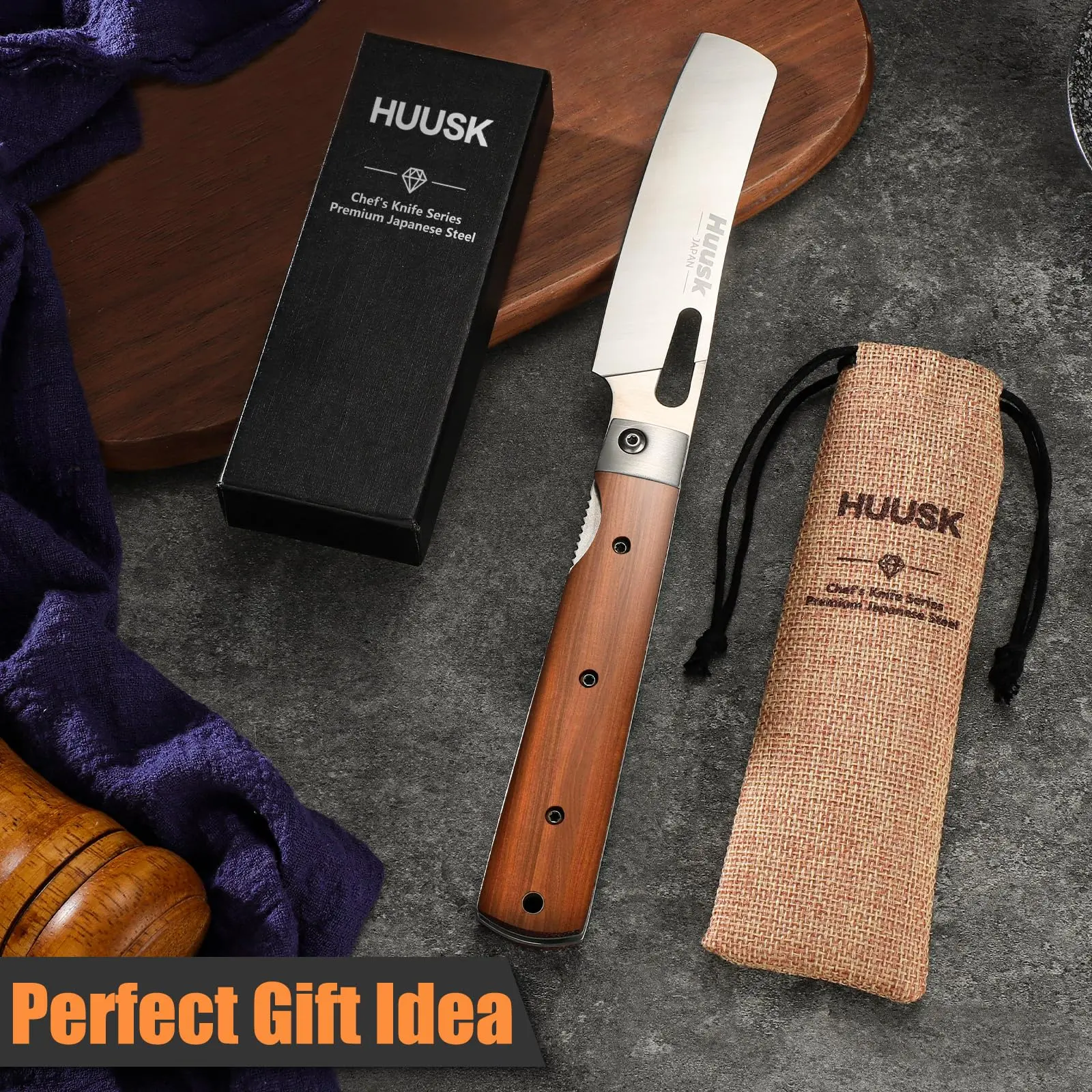 UNIQUE MATERIALS and DESIGN: The Folding Nakiri Knife is made of high-quality 440C stainless steel(10inches), offering an ultra-sharp blade and excellent wear resistance. Designed for straight chopping, it provides precise, clean cuts for vegetables like onions and ginger. The liner lock ensures safety during use.