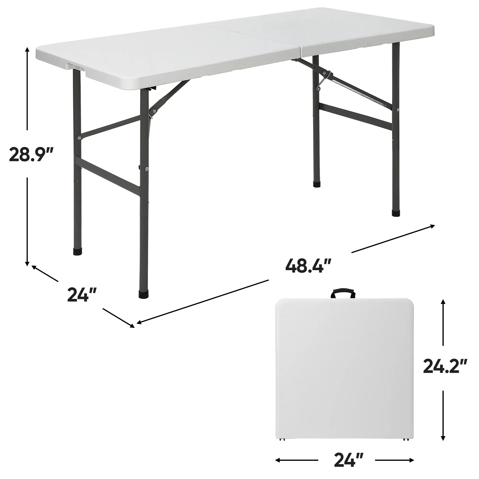 It is constructed of premium HDPE top and solid steel legs. The surface is waterproof, scratch-resistant and impact-resistant, which also can withstand up to 300 lbs, and includes non-marring foot caps to protect your floors from scratches.