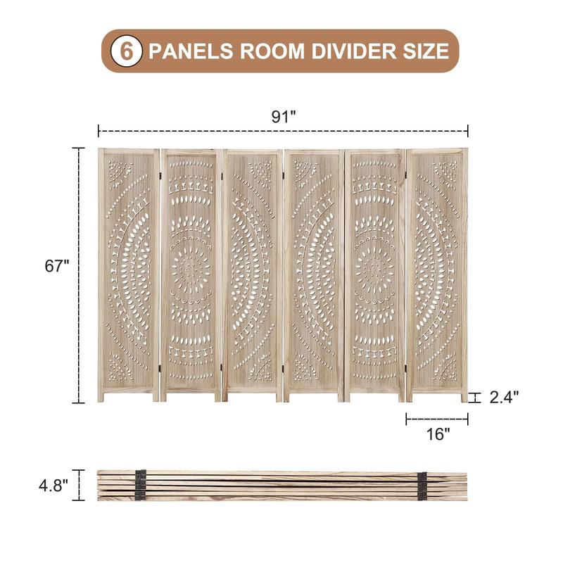 · ✔ TWO DIFFERENT SIZES:Our room devider has two different sizes:①6 Panels Unfolded size:91"W x 67"H ;Folded size:4.8"W x 67"H;②3 Panels Unfolded size:47.25"W x 67"H;Folded size:2.4"W x 67"H;The single panel size:16"W x 67"H;Beautiful wall dividers for home office restaurant bedroom.