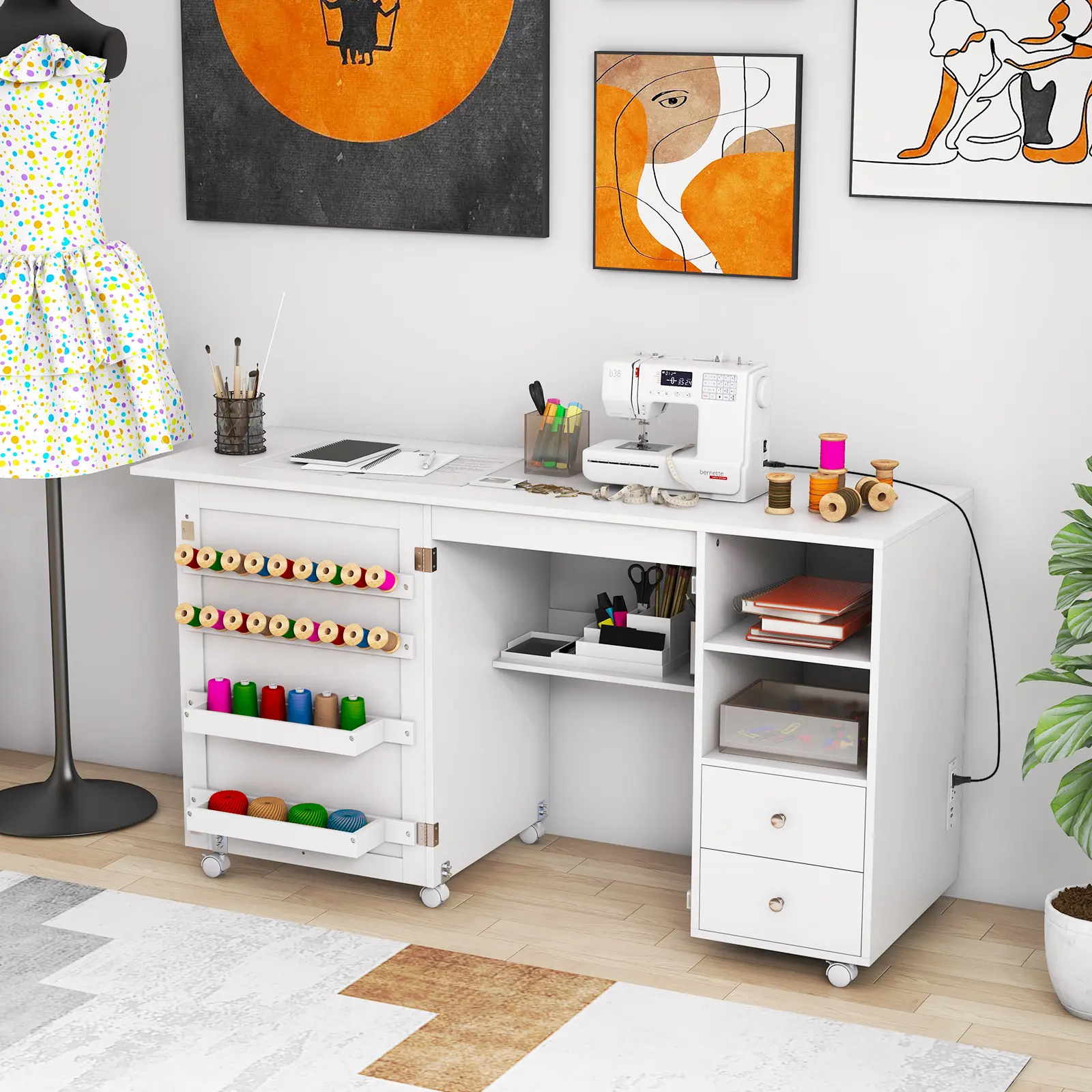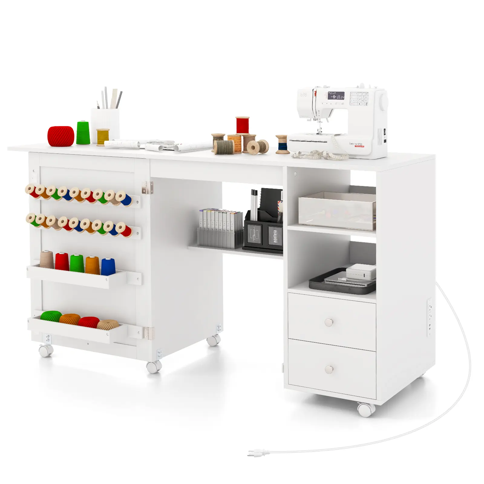● Always Powered, Always Ready: Featuring a built-in charging station with 2 AC outlets and 2 USB ports, this sewing table ensures your essential crafting tools and devices stay powered. ● Ample Storage Solution: This craft desk is designed with 2 yarn holders, 2 drawers, 3 storage shelves and 18 thread racks, which provides ample room to neatly store and organize your supplies. ● Folding for Saving Space: This craft table with drop leaf folds away effortlessly, making it ideal for small spaces and multipurpose rooms. Expand when you are creating and fold down for easy storage when not in use. ● Rolling Convenience: Equipped with 6 universal casters featuring brakes, this sewing cabinet offers unparalleled mobility and stability across various floor surfaces. Wheel it out when you need it and securely lock it in place for a steady crafting session. ● Reliable Construction: Crafted from high-quality MDF, this sewing desk is built to last. It provides a stable and reliable surface for your sewing machine (not included), ensuring a smooth and precise sewing experience every time.