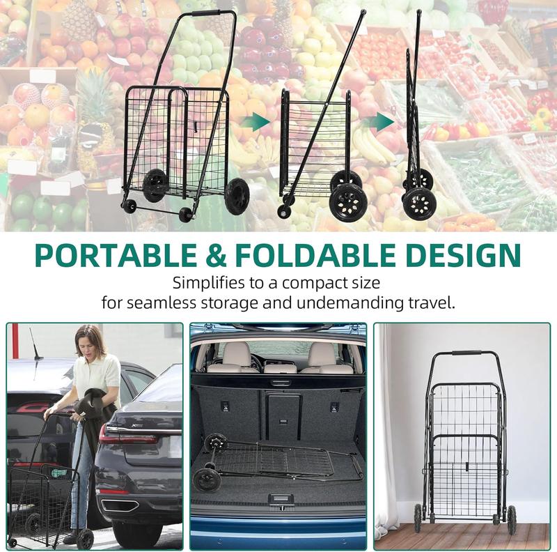 Easy Folding Design: This shopping cart features a foldable design, allowing for easy storage and transportation. Simply collapse the cart with a quick motion, and it becomes compact and space-saving. Fit for seniors or anyone with limited storage space.
