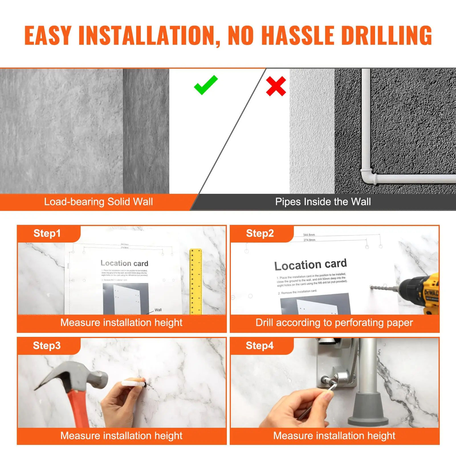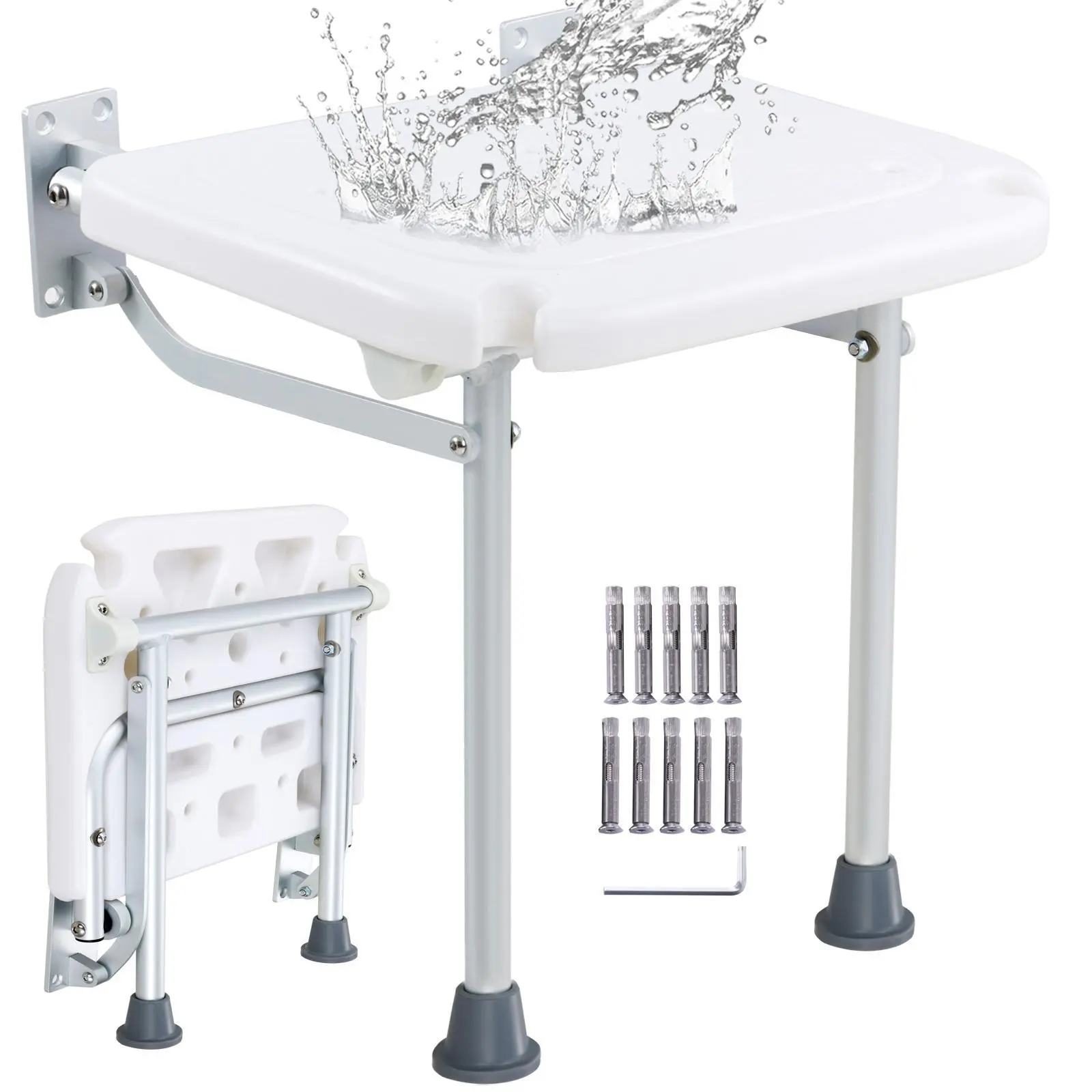 • Drill-Hole Wall Mounting: Thoughtfully equipped with mounting hole guiding sticker for precise drilling – no need for additional markings with a pen. Complete with 304 stainless steel screws and other accessories, ensuring secure fixation. Note: Install our folding shower seat on load-bearing solid walls.